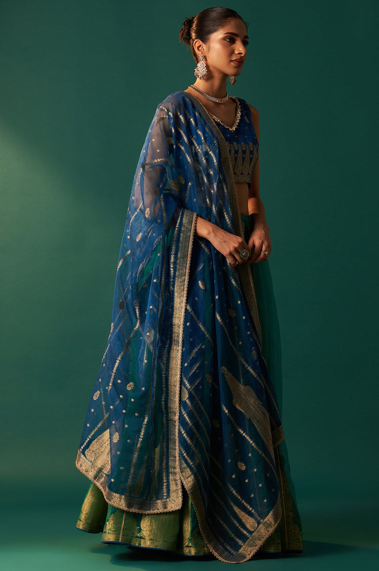 Blue Zari Embroidered Jacquard Blouse with Parrot Green Lehenga and Dupatta Set