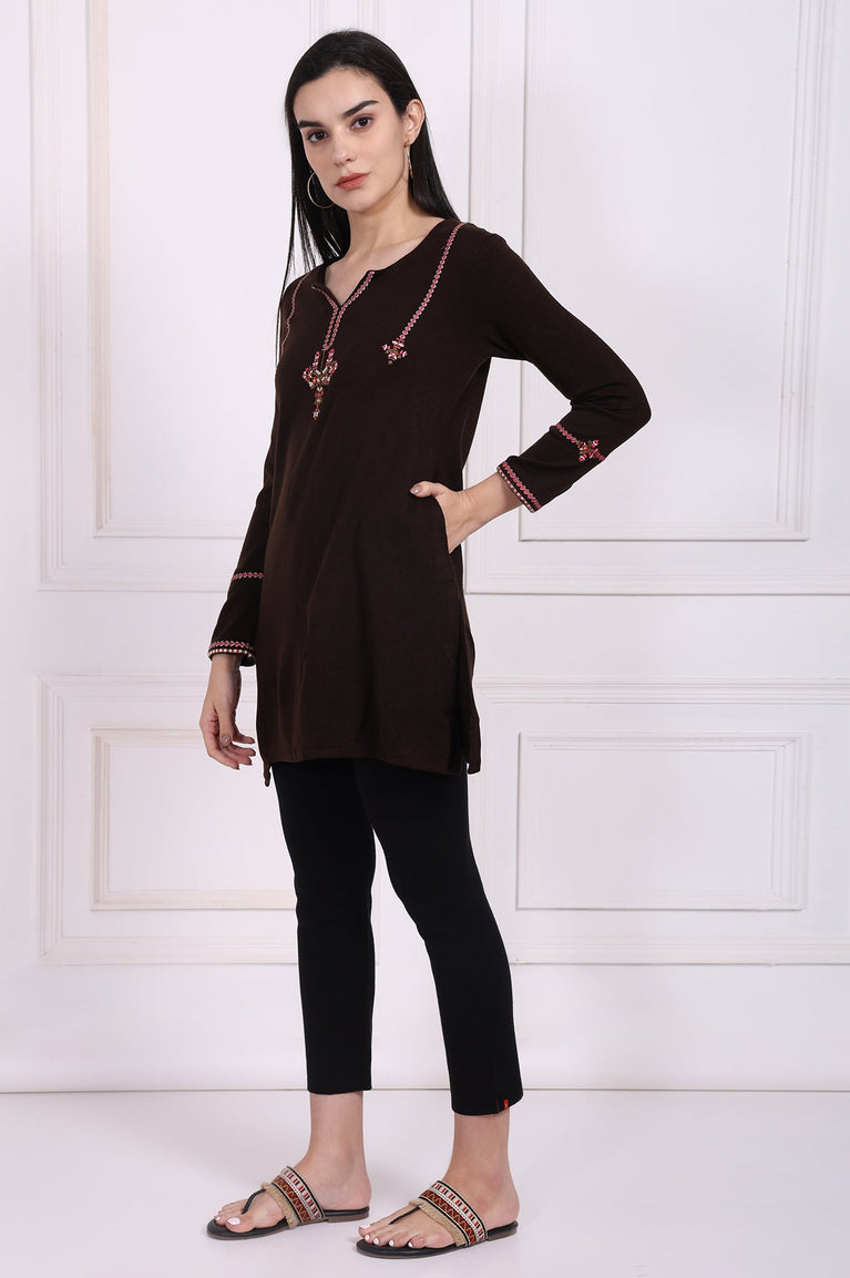 Warmth meets artistry in this beautifully crafted tunic for women, a sublime choice for navigating the cooler seasons with grace. Rendered in a deep, earthy tone that evokes a sense of grounded elegance, this apparel is a testament to contemporary ethnic design. The silhouette is thoughtfully constructed, featuring a flattering notched V-neckline that draws the eye to the stunning, multi-hued thread embroidery gracing the yoke. This intricate ornamentation, a delicate dance of floral-inspired motifs, is tastefully mirrored at the cuffs of the cozy full-length sleeves, creating a harmonious and polished look. As an essential piece of ethnic wear for women, it's designed in a timeless straight cut that drapes beautifully over the frame. This classic shape ensures comfort and unrestricted movement, which is thoughtfully enhanced by the inclusion of side slits at the straight hemline. The fabric is completely opaque, offering modest coverage and a confident feel throughout the day. Hidden within the seams are discreet pockets, a practical touch that adds to the tunic's everyday appeal. This brown embroidered winter tunic is more than just a garment; it's a versatile statement of style, perfect for casual outings, office wear, or intimate festive gatherings. You'll find yourself reaching for this elegant straight acrylic kurti again and again.