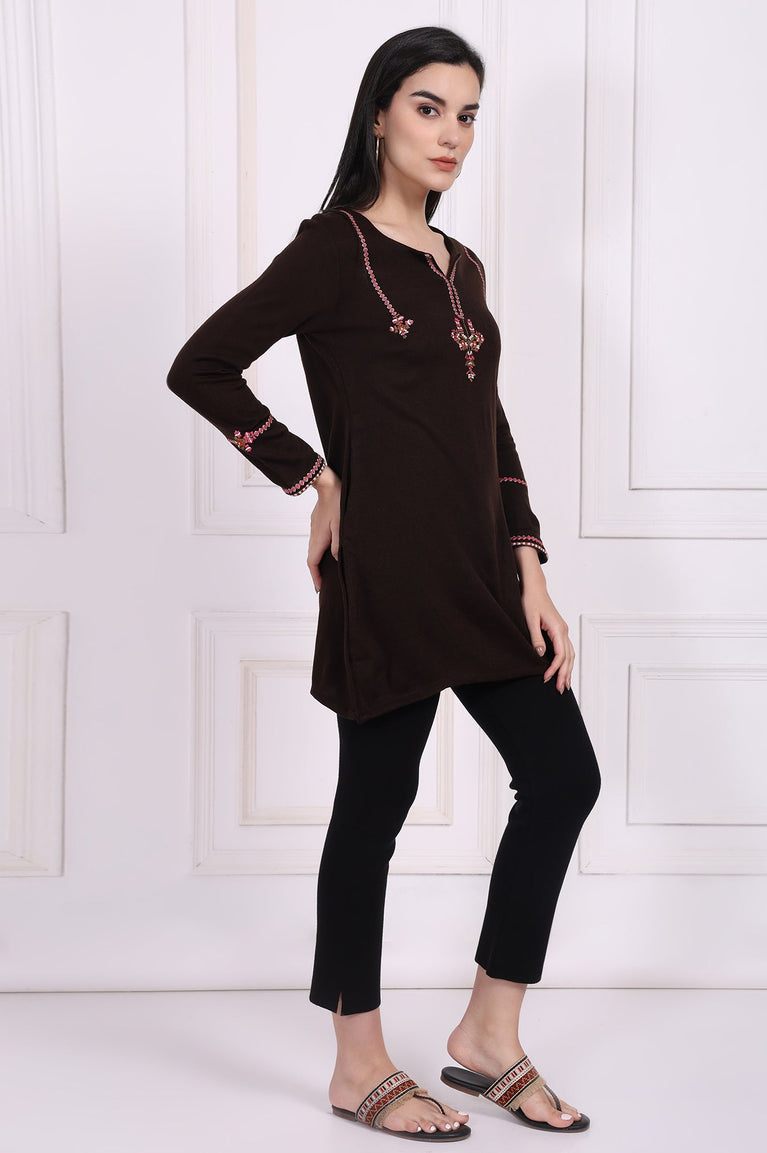 Brown Embroidered Straight Acrylic Tunic