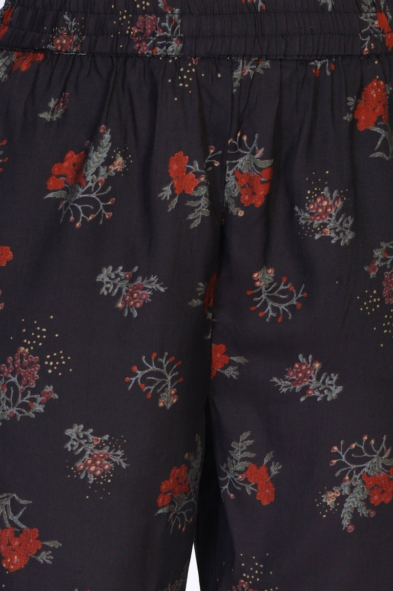 Black Floral Printed Tape Detail A Line Crape Kurta with Pant and Dupatta Set
