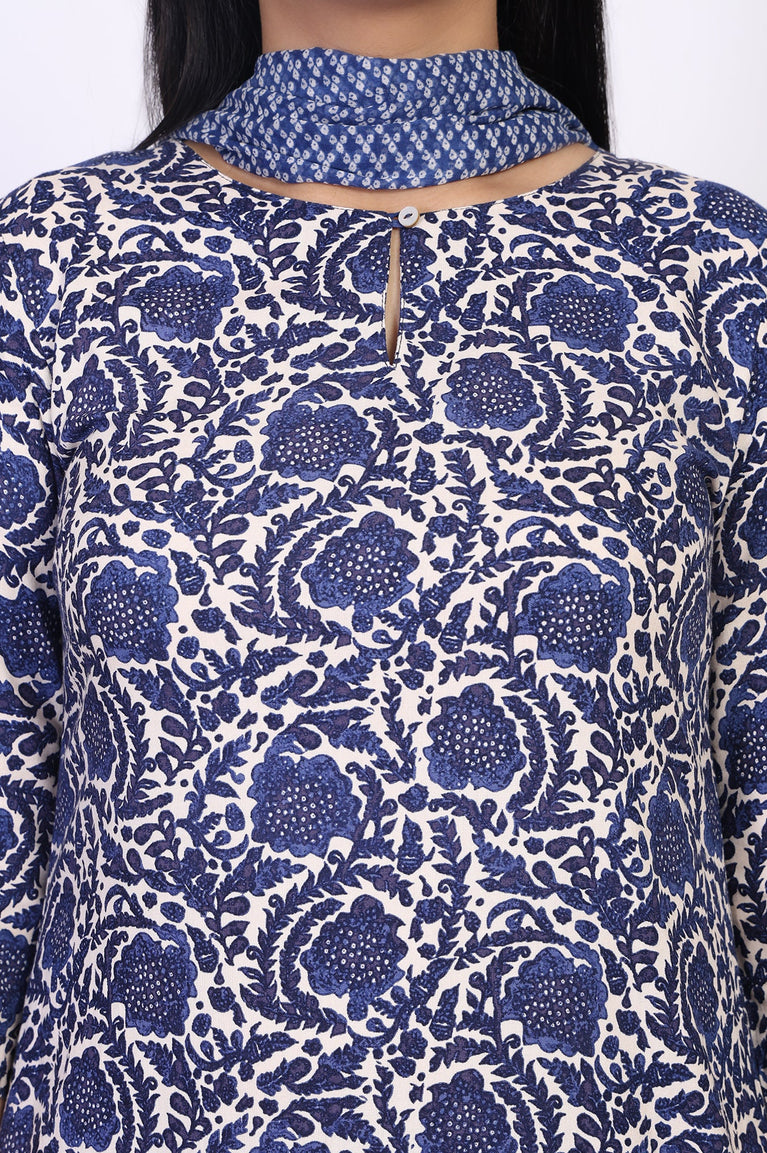 A story told in Indigo Tile patterns, this kurta set for women is a celebration of artisanal charm. The ensemble glides with you, offering a look that's as comfortable as it is captivating. Designed as a versatile ethnic co-ord set, it features a straight-cut kurta with an elegant keyhole neckline and relaxed three-quarter sleeves. The all-over floral block print on the tunic is a nod to timeless craft, flowing down to a clean, straight hemline with functional side slits for ease. This beautiful kurti set is paired with straight pants showcasing a complementary ditsy print, ensuring a cohesive yet dynamic look. To complete the trio, a lightweight dupatta with a subtle geometric pattern adds a final layer of grace. Opaque for confident wear, this three-piece ensemble is your perfect companion for brunches, casual gatherings, and days when you want your style to speak softly but surely. You'll love the effortless sophistication of this complete floral print kurta pant set.