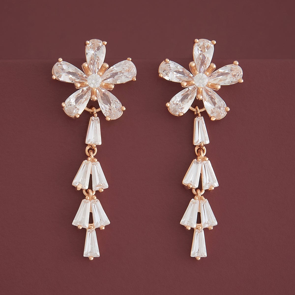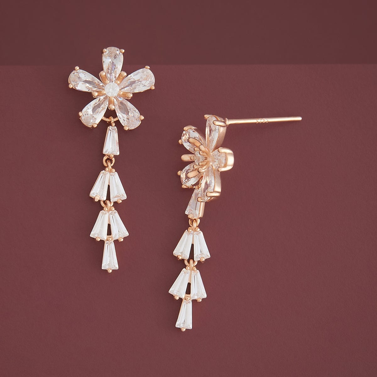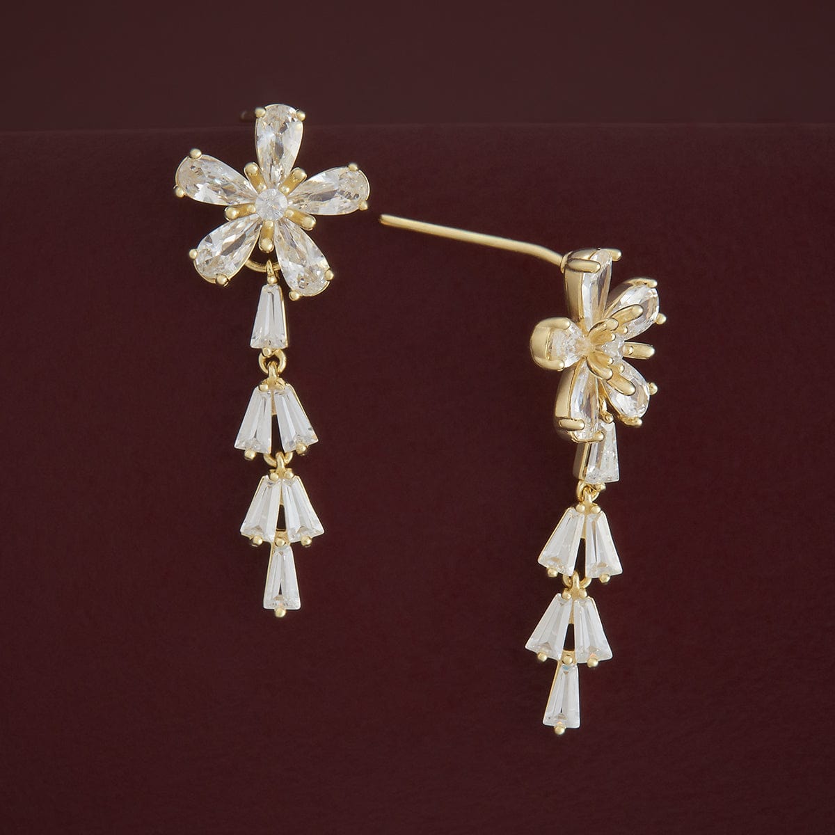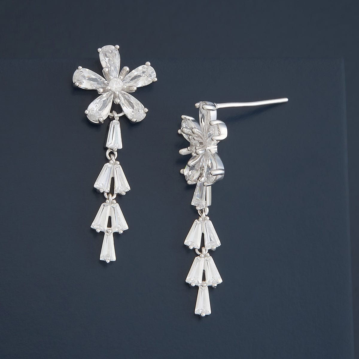 Achieve effortless style with these 92.5 silver earrings from Kushal's Fashion Jewellery. Featuring stunning white zircon stones, they add a touch of sparkle to any look. Crafted from 92.5 silver, these flower-shaped hangings are available in gold, rose gold, or rhodium polishes to choose from.