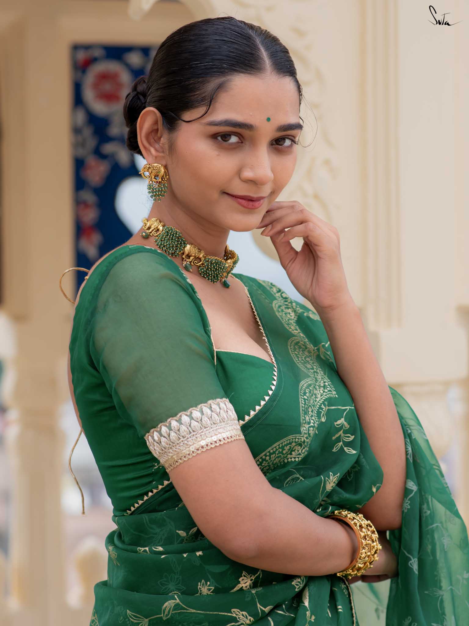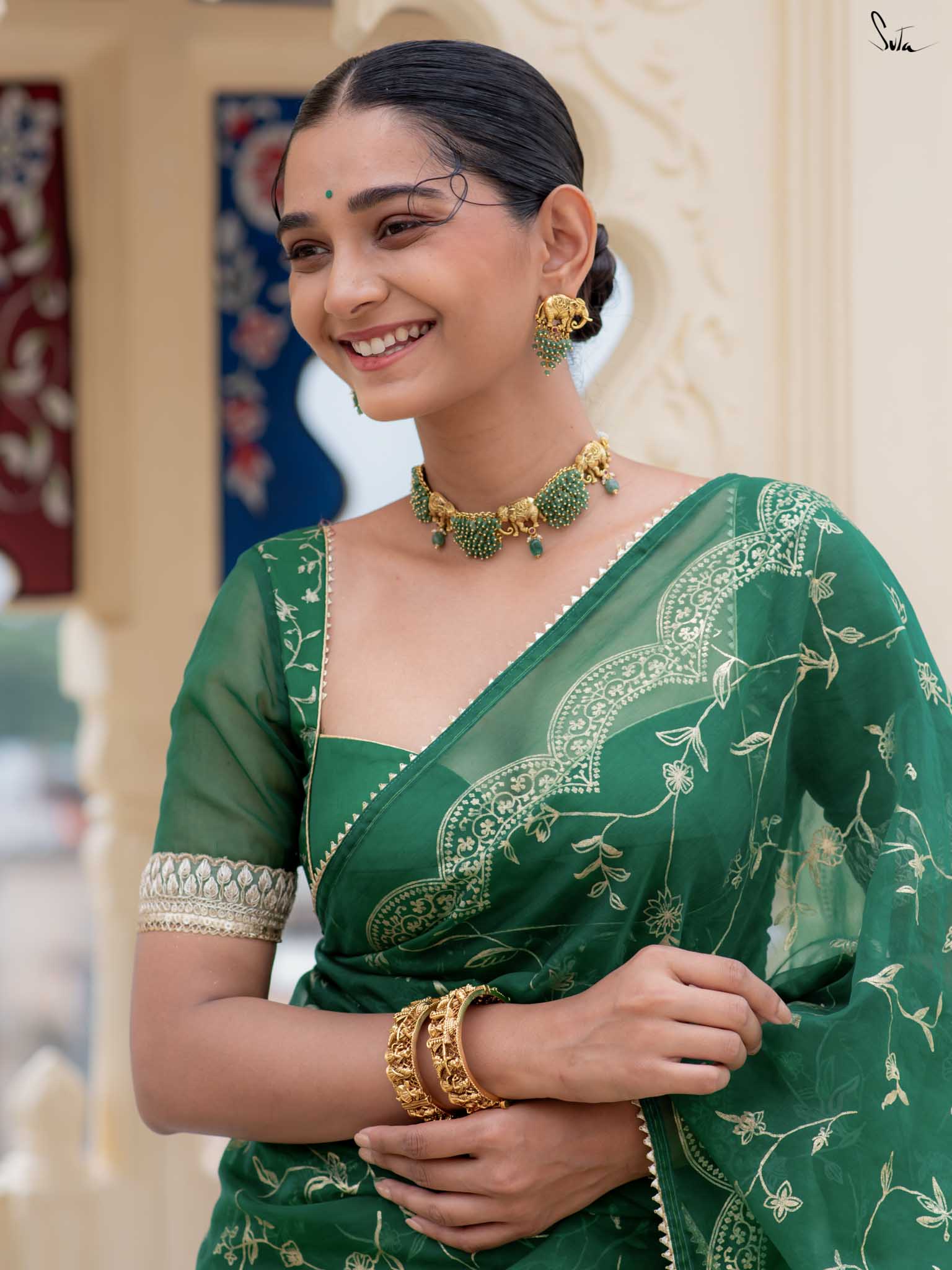 Bring a sparkling touch to your festive or wedding ensemble with Aam Panna Twist, a half-sleeve blouse in refreshing green foil organza. Featuring a sweetheart neckline and delicate golden floral foil prints with intricate lace detailing, it’s perfect for bridesmaids or festive celebrations.