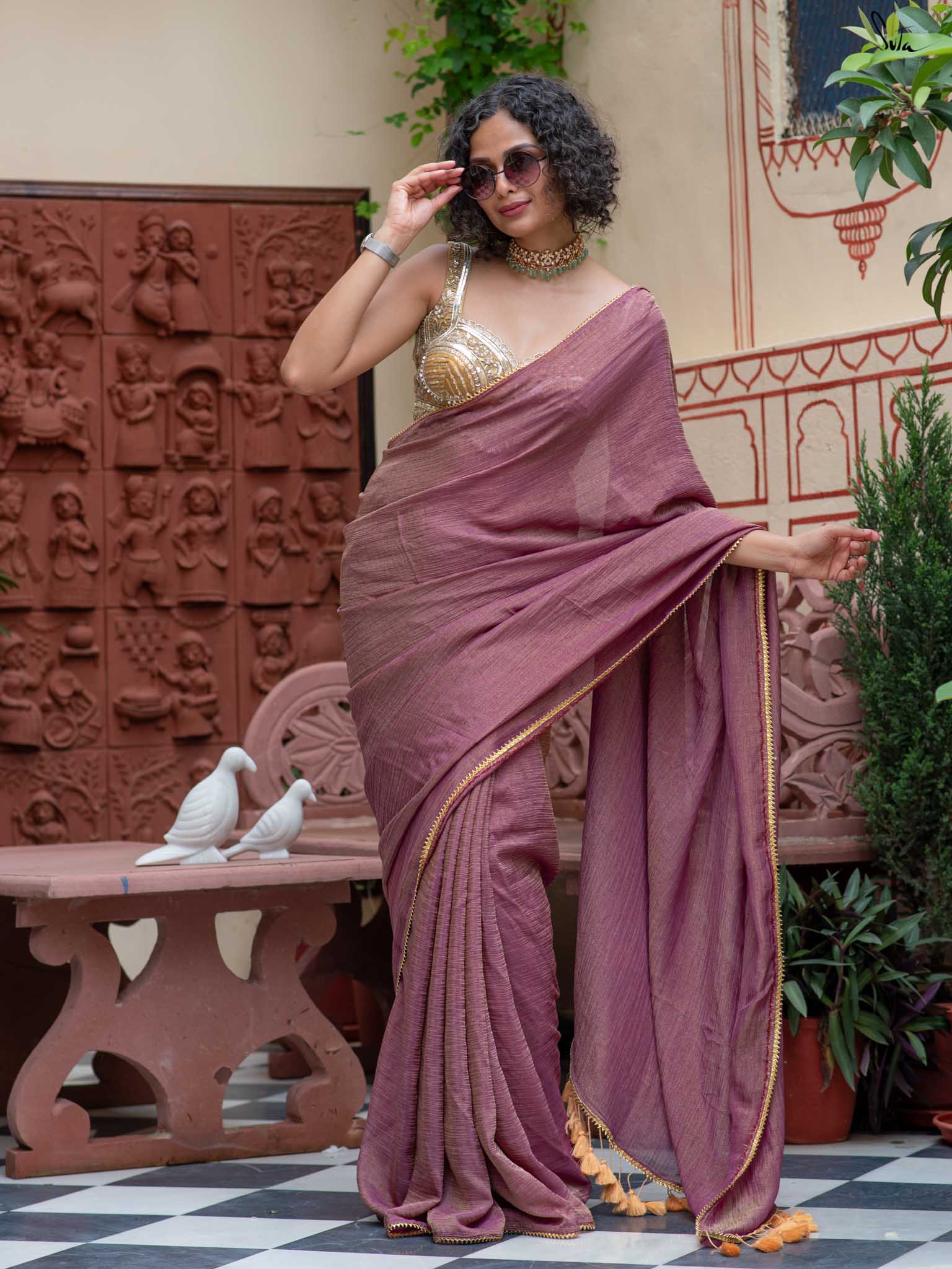 A glass of bold poured into the fabric. This wine crushed viscose saree is rich, moody, and unapologetically dramatic. Contrast tassels and a streak of gota at the border add that intoxicating flash of glam.