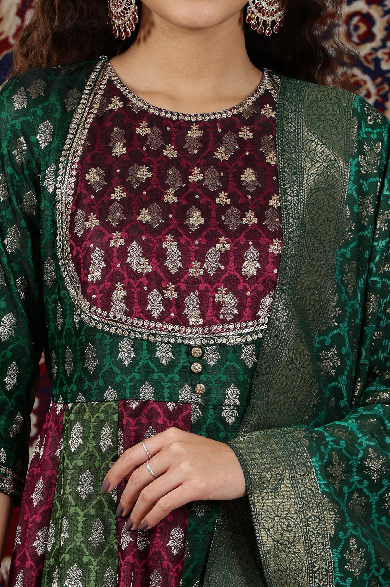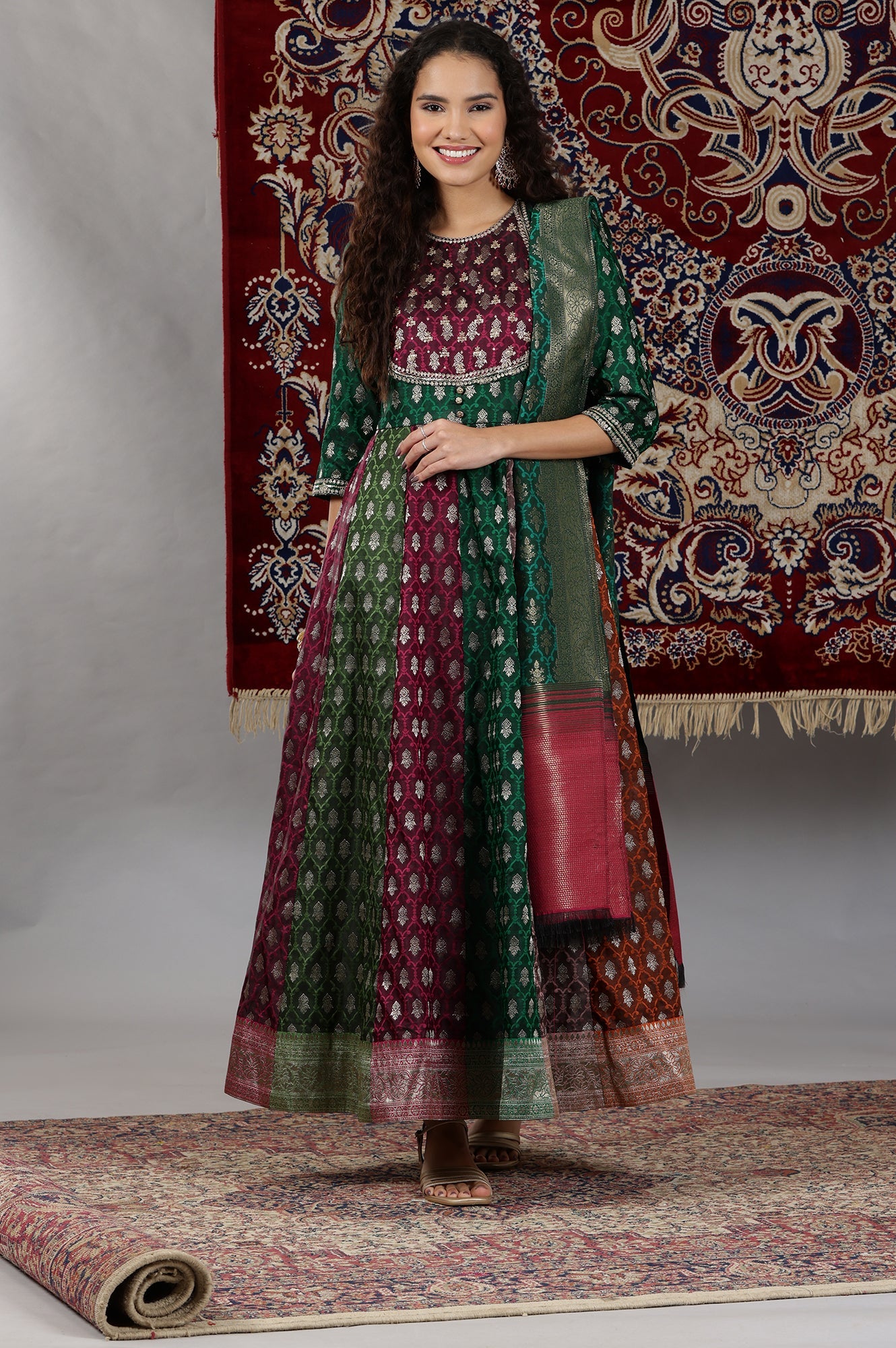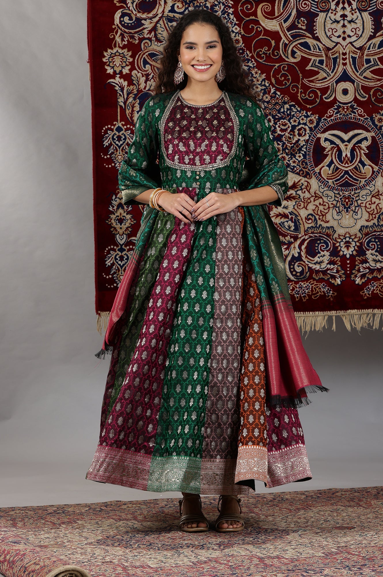 The Anarkali kurta showcases a heritage yoke and an exquisite embroidery along the neckline and sleeve hem, blending traditional with elegance. Enhanced by attached multi coloured kalis, a back one button keyhole opening, and stylish tassels, this ensemble exudes sophistication and charm with a touch of modern flair.