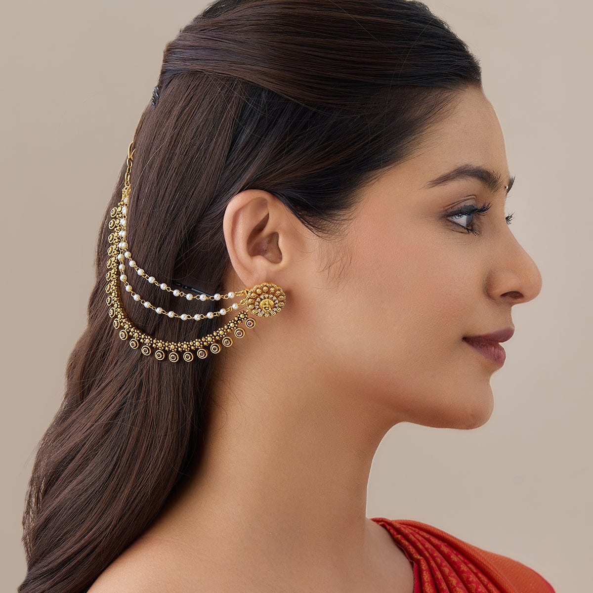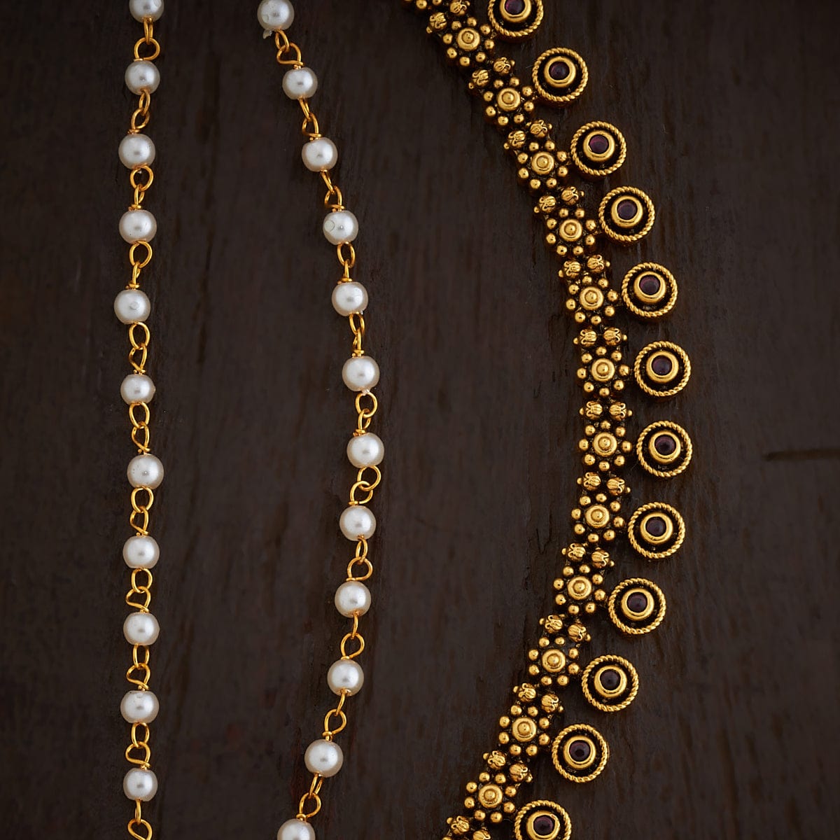 Enhance your traditional look with the exquisite charm of our antique matil. Crafted with intricate details and adorned with ruby stones, this matil adds a touch of elegance to your overall appearance. The gold-polished finish complements the traditional motifs, making it a perfect accessory for weddings and festive occasions.