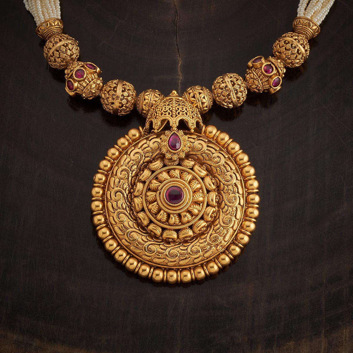 Jewellery is the favorite element among women, boosting your looks and self-assurance. Antique jewellery has become a trend lately. Make your impression long-lasting with this ancient and classic piece of antique necklace. This piece is intricately designed, gold-polished and studded with ruby stones, demonstrating a masterpiece of the vintage era.