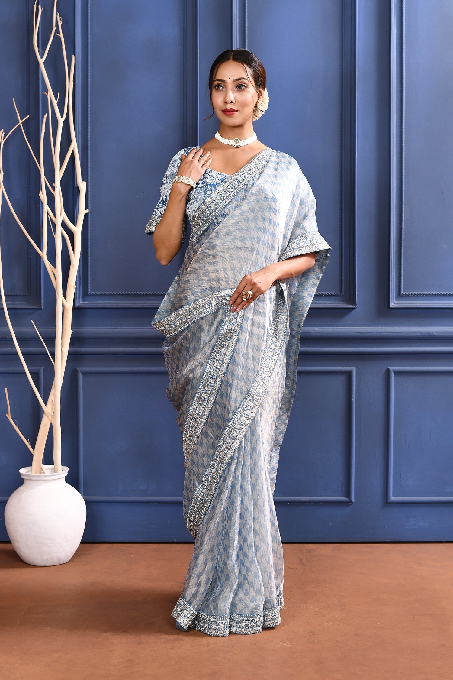 The aqua blue printed tissue saree with embroidered self border and stitched blouse for a stunning look with traditional elegance.
