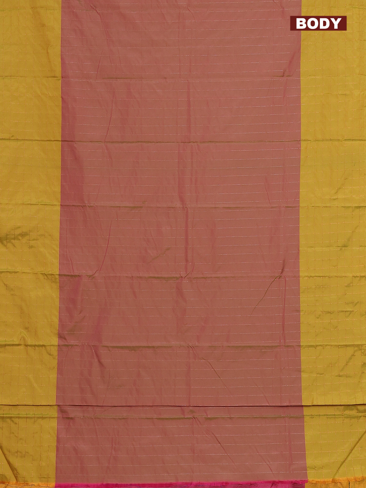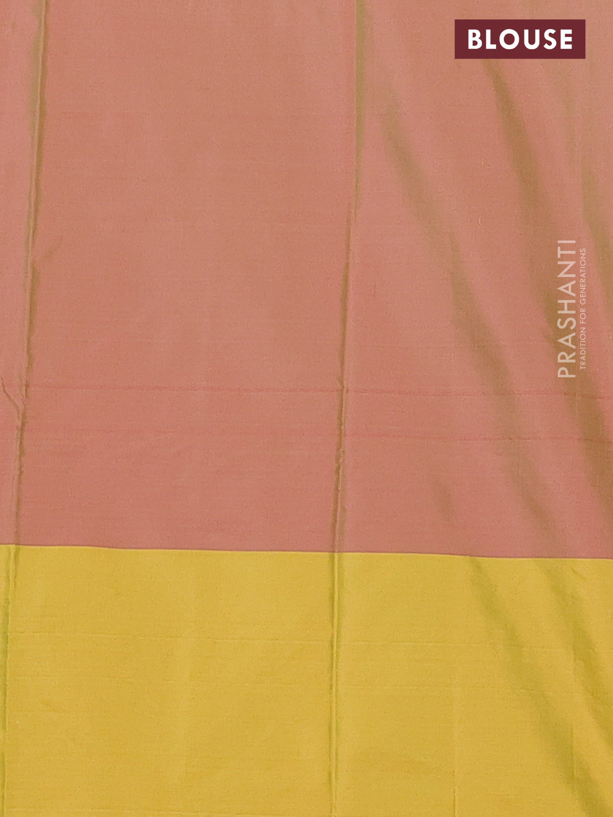 Arani semi silk saree dual shade of pinkish green and lime yellow with allover copper zari weaves and zari checked border