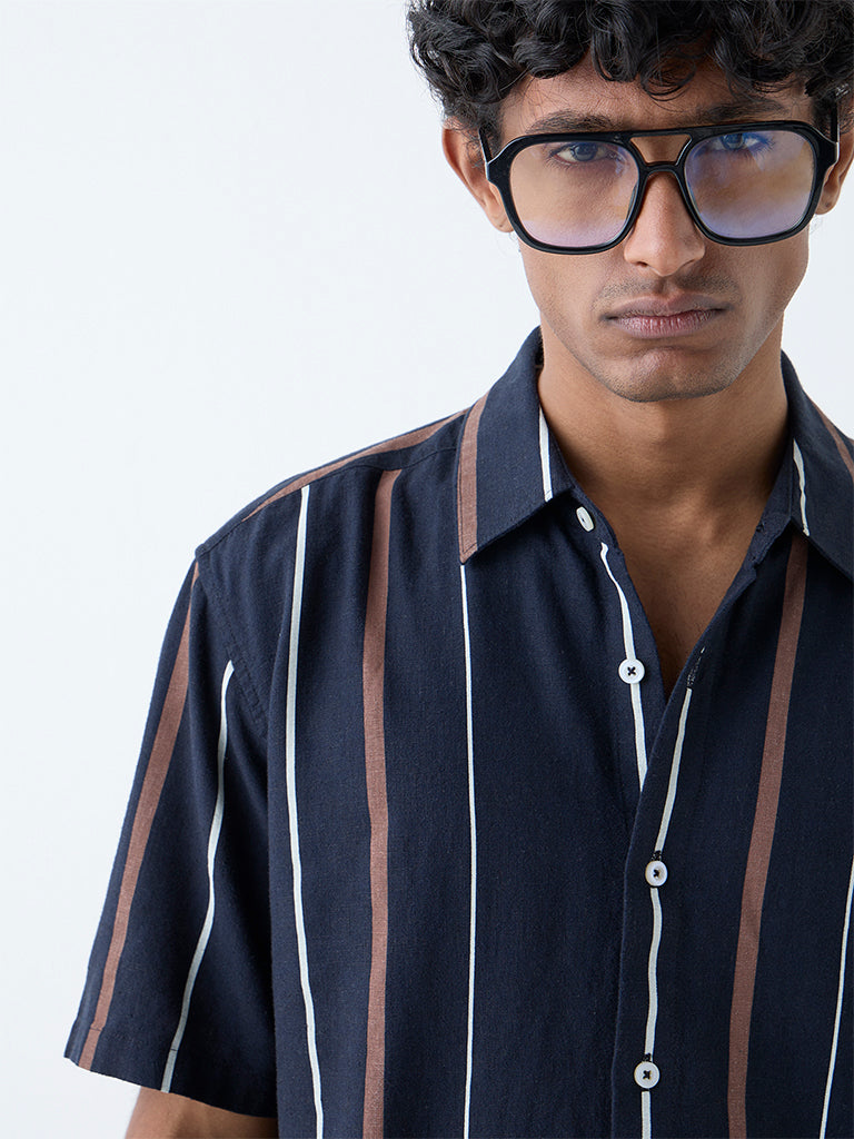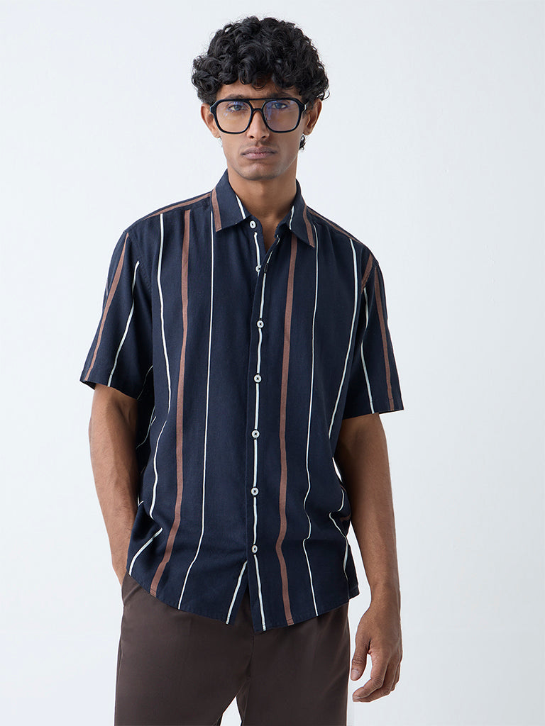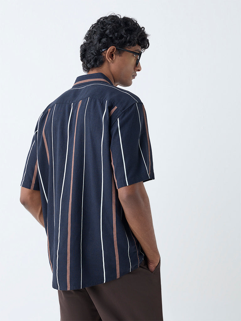 This navy shirt from Ascot is defined by contrasting stripes that lend a refined yet contemporary edge. Shaped in a relaxed silhouette, it drapes with ease while retaining a polished finish. The spread collar and button placket bring timeless structure, while short sleeves add a breezy touch.