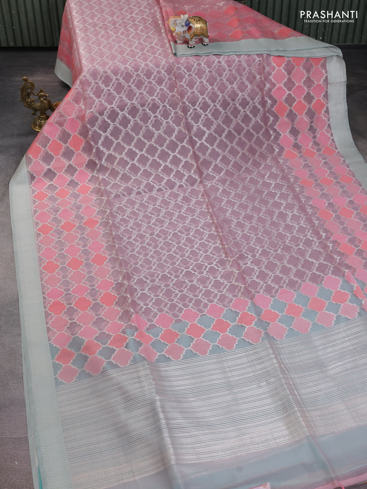 baby pink and teal blue Banarasi kora jamdhani silk saree