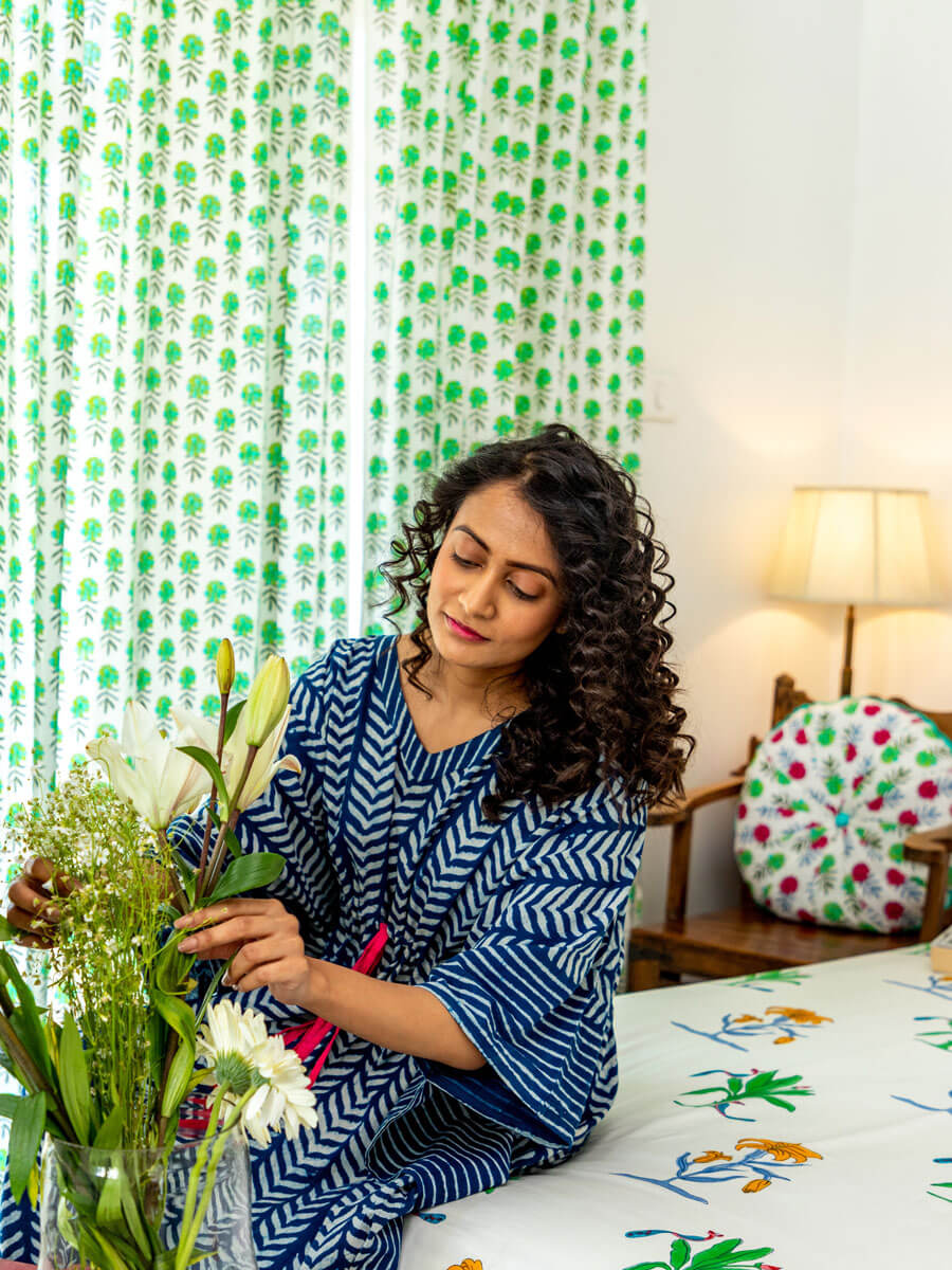 Megha, a hand block print collection reminiscent of unanticipated rain on a hot summer day. A sweet surprise when you least expect it. The heart sings and the soul dances with refreshing sprinkling of cool water. Flowers bloom, birds sing a sweet song, and dragonflies create magic in the air. One wishes to hoard away the dewy petrichor in a crystal bottle just because the moment of unexpected rain on a hot sultry day is so beautiful that being greedy feels right. That is our Megha, one that inspires to love with abandon, to desire for more and to soak in the moment.