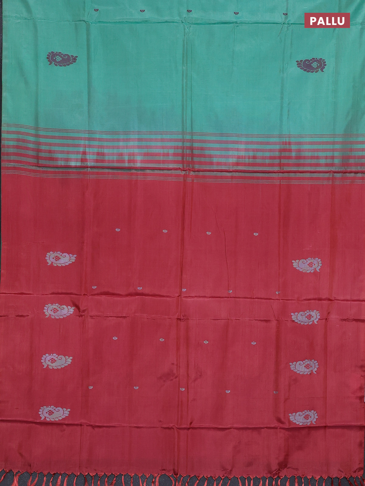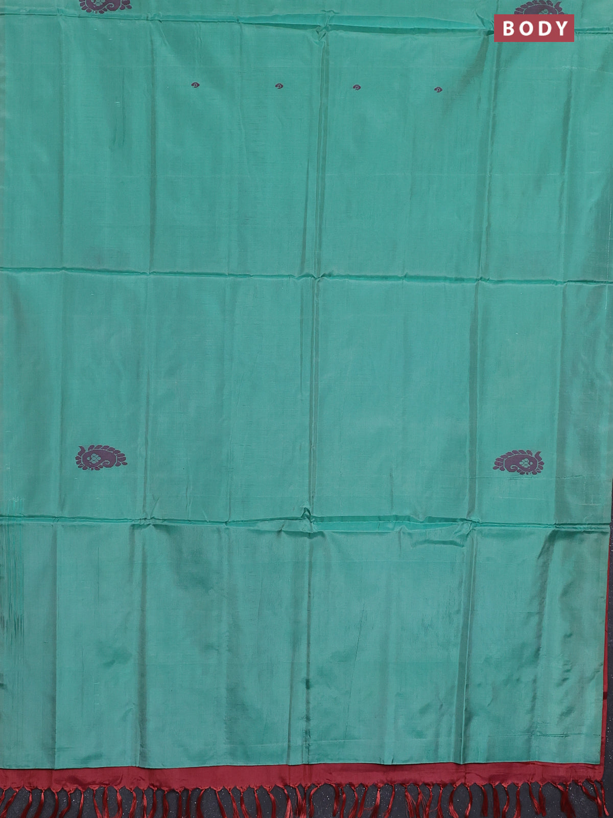 Banana pith saree teal green shade and maroon with thread woven buttas in borderless style