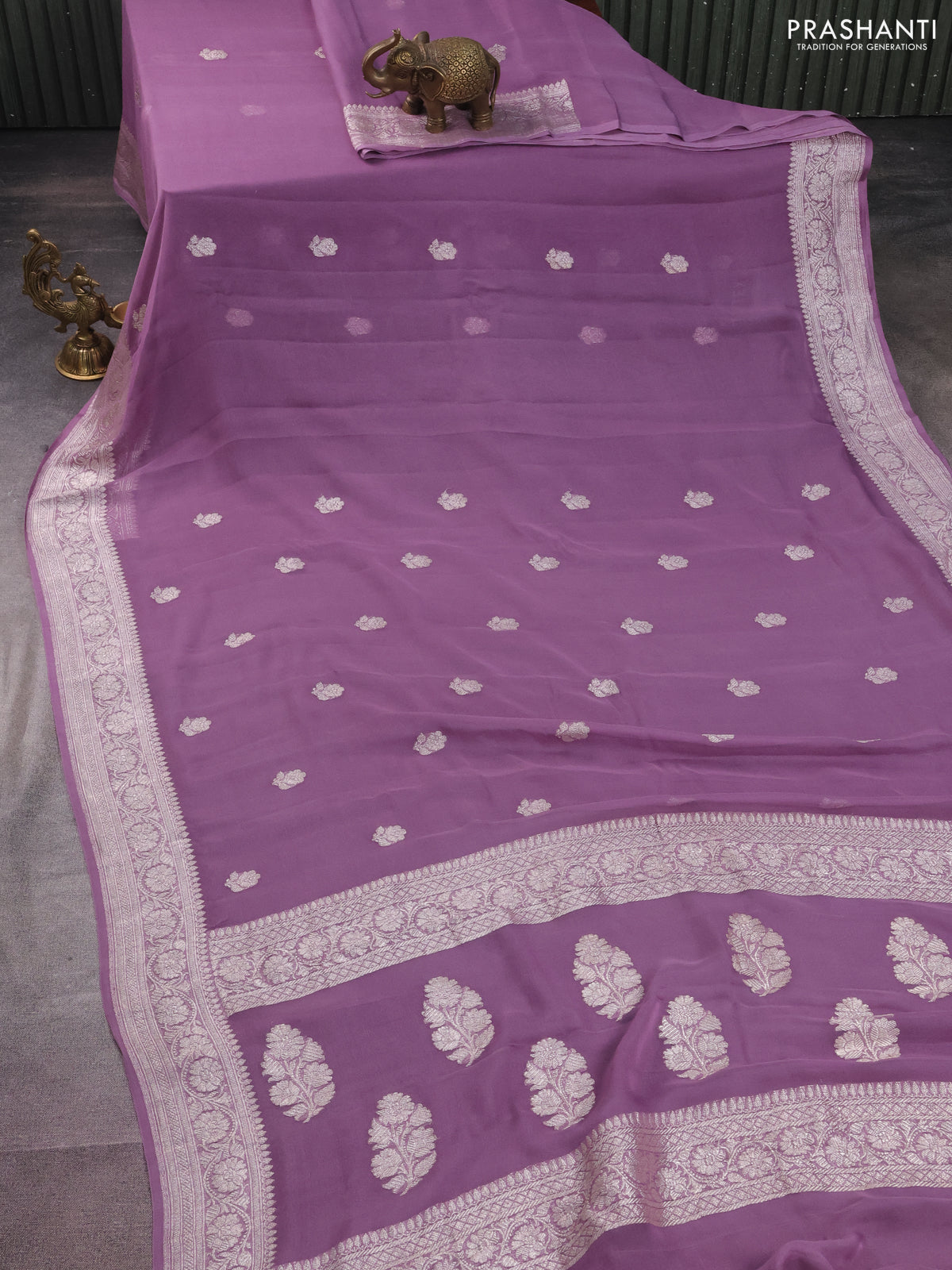 Banarasi chiffon silk saree pastel purple with silver zari woven buttas and silver zari woven border