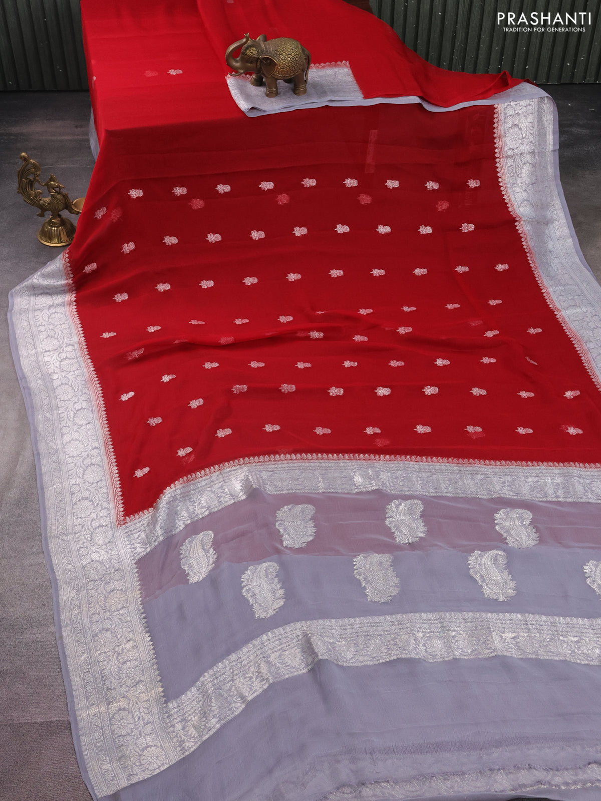 Banarasi chiffon silk saree red and grey with silver zari woven buttas and floral silver zari woven border