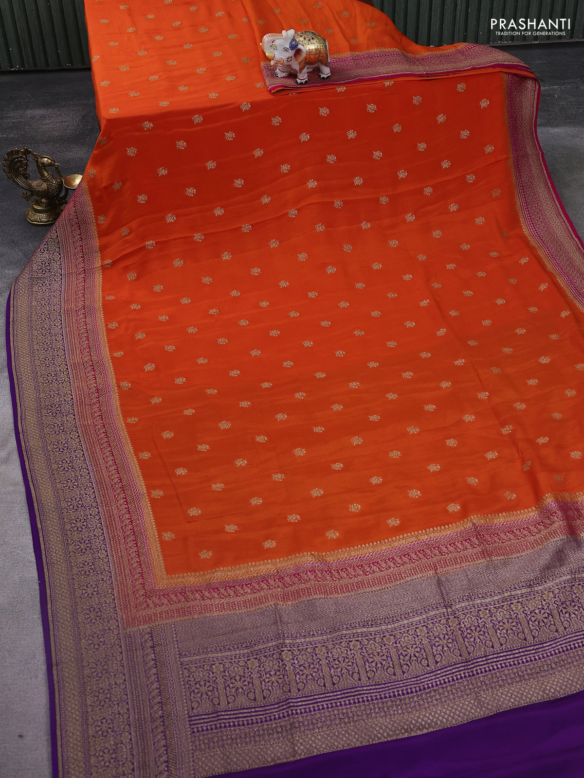 Banarasi crepe saree orange and pink violet with woven buttas and long woven border