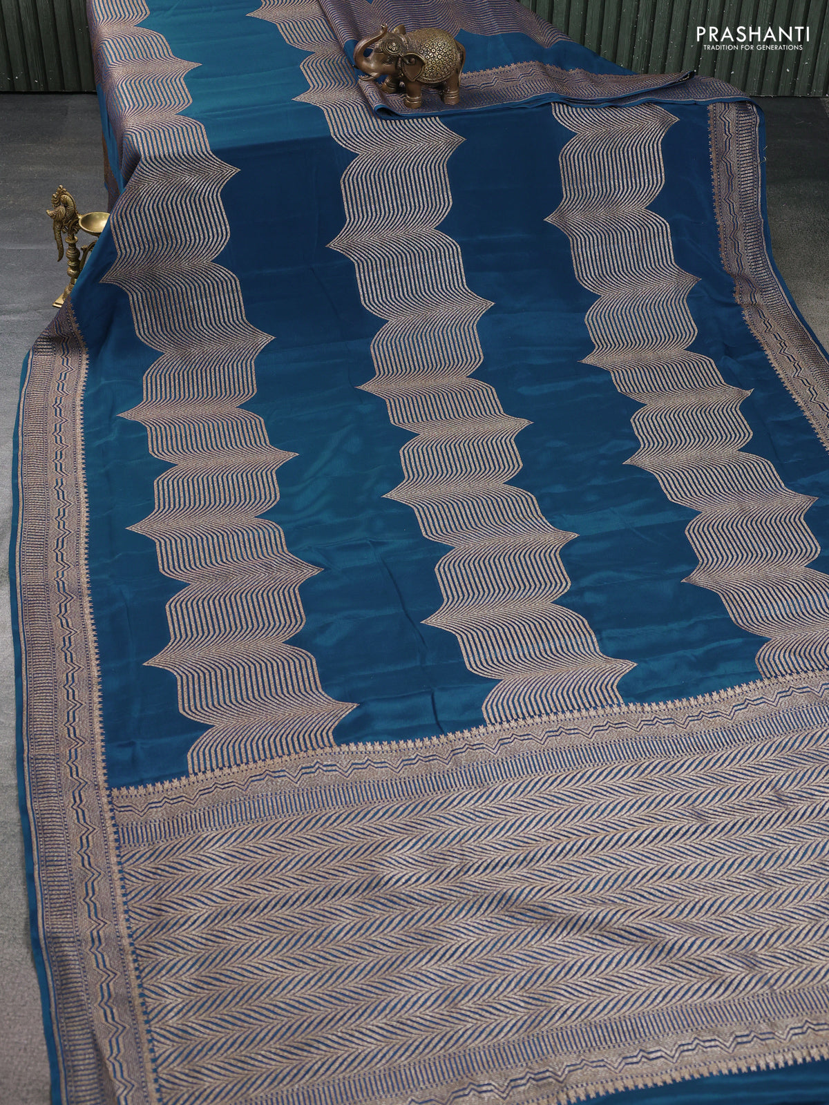 Banarasi crepe saree peacock blue with allover geometric weaves and woven border