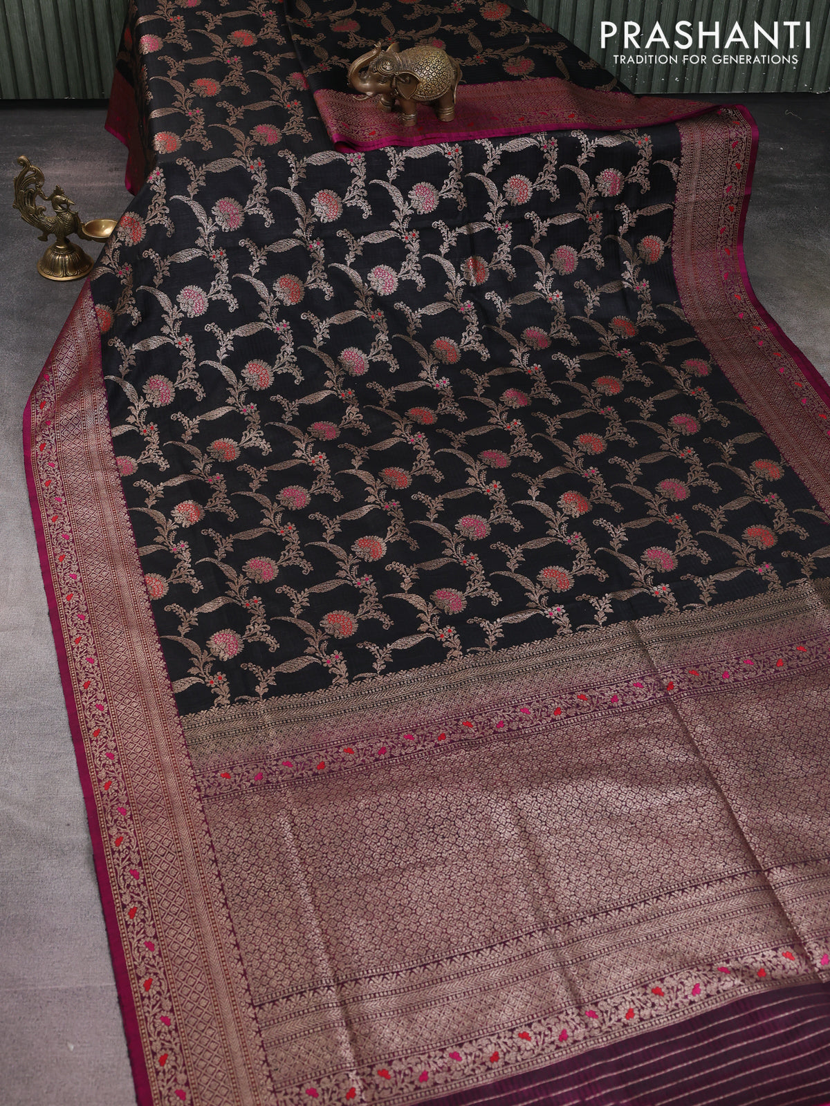 Banarasi dupion silk saree black and purple with allover thread & zari floral weaves and woven border