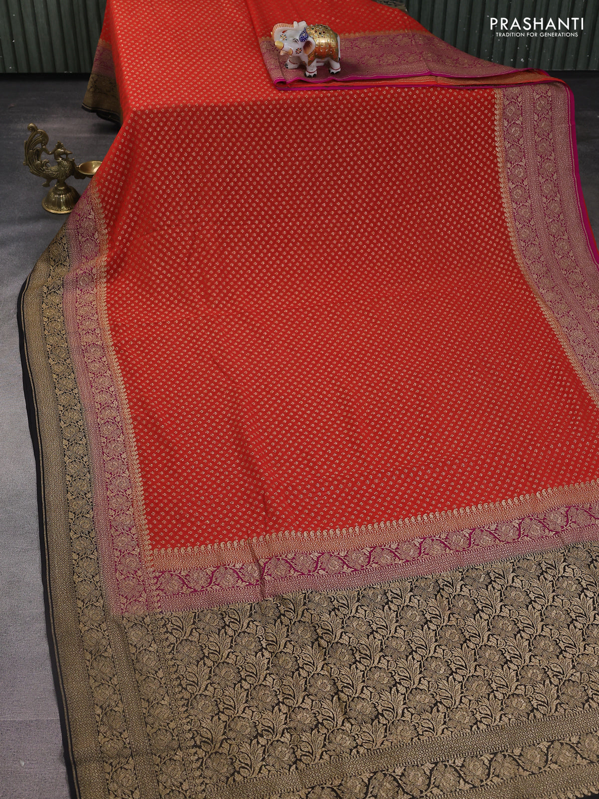 Banarasi georgette saree orange and pink black with allover woven buttas and woven border