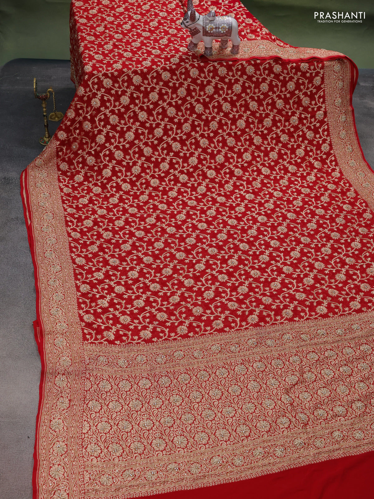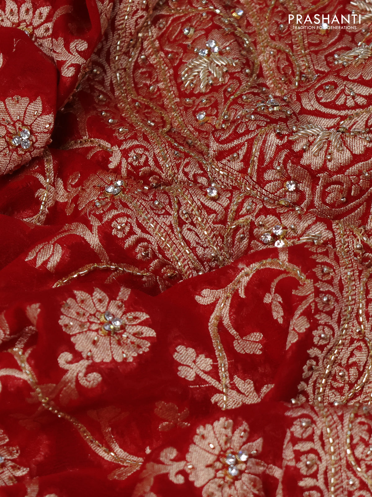 Banarasi georgette saree red with allover jaal weaves & stone work and zardosi work border