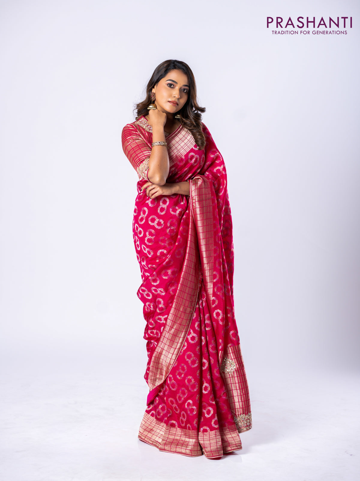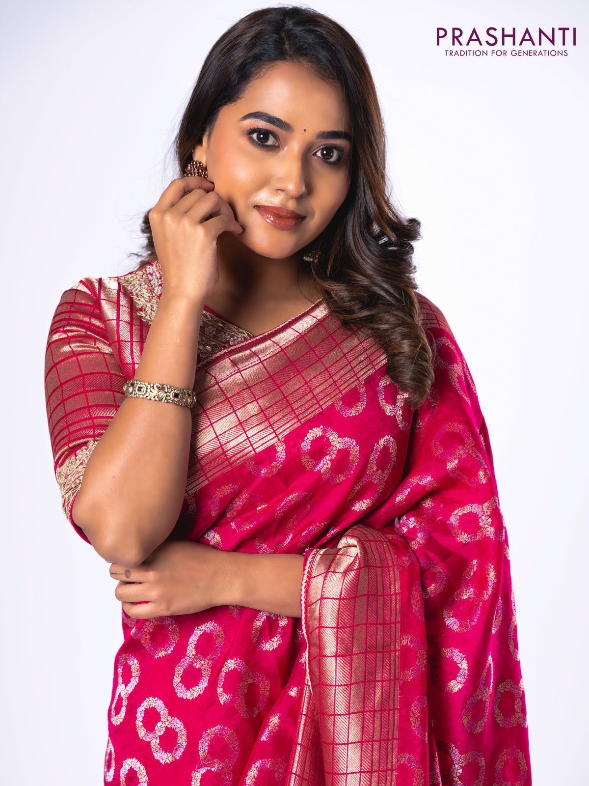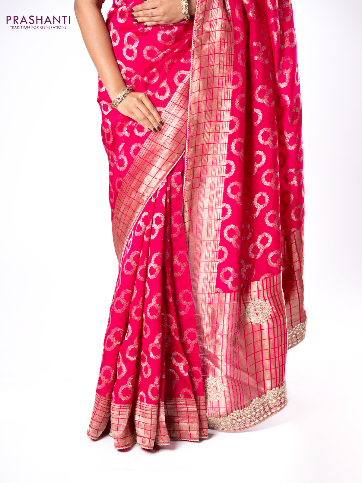 Banarasi munga silk saree pink with allover silver & gold zari weaves and zari woven lace border