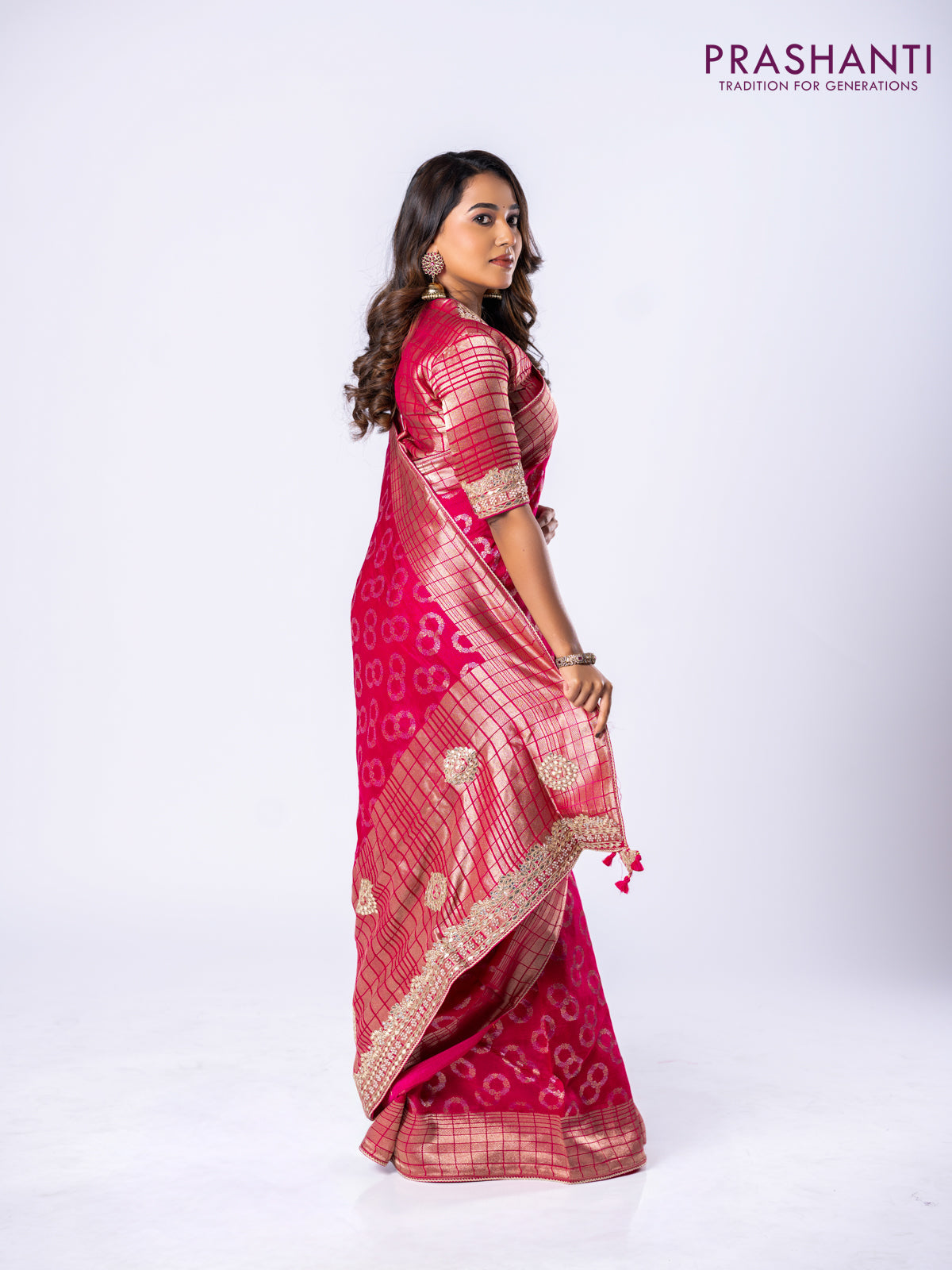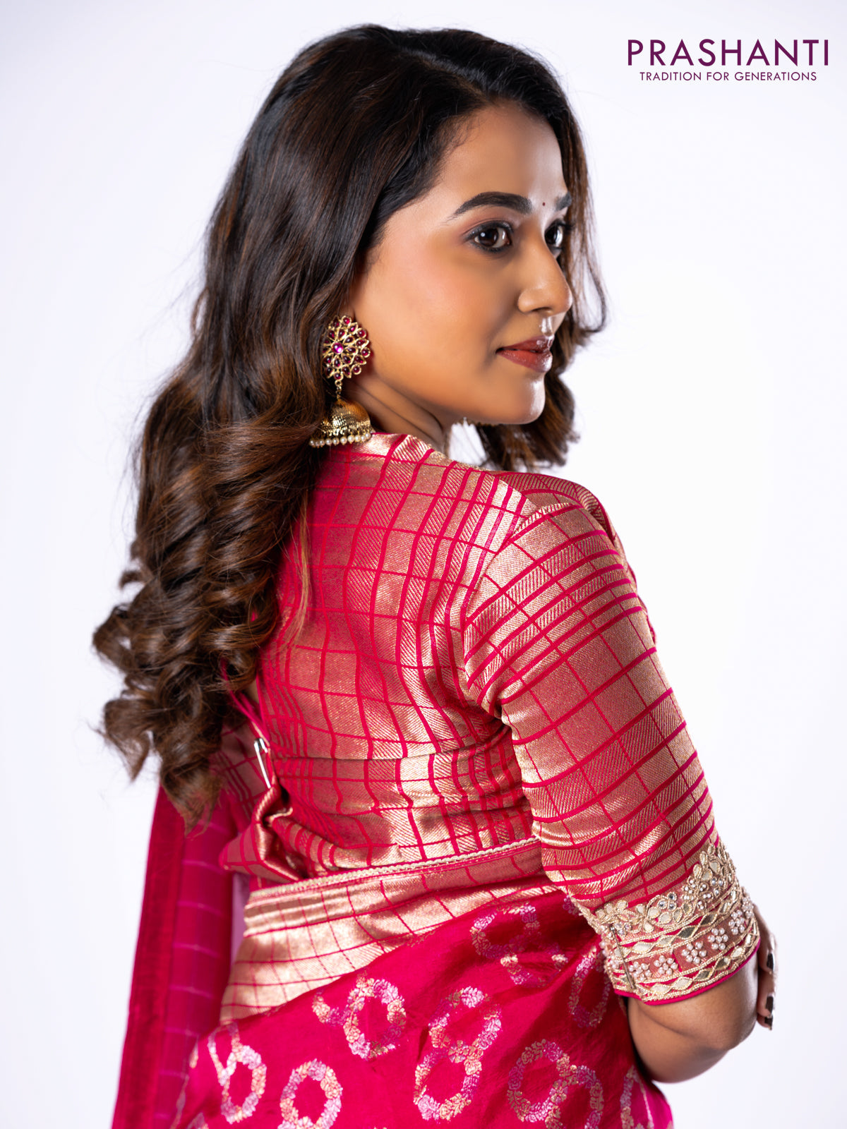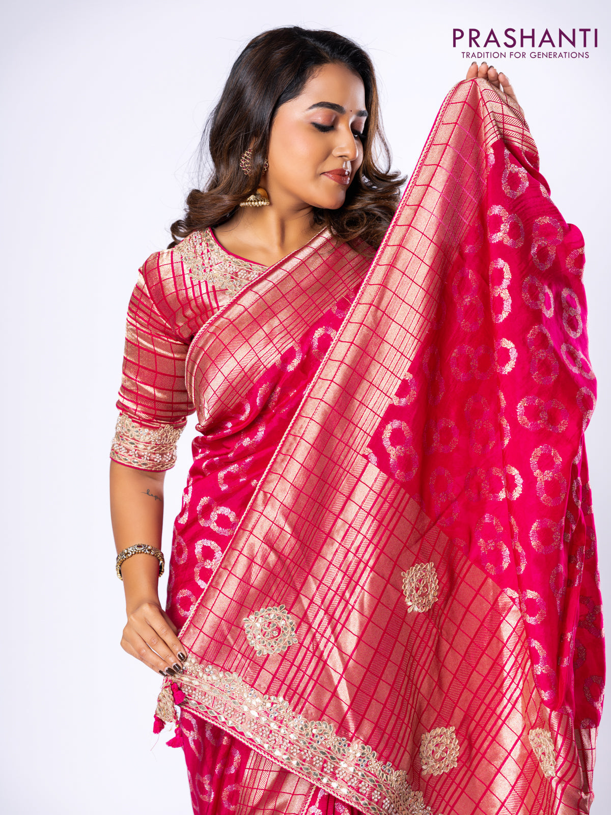 Banarasi munga silk saree pink with allover silver & gold zari weaves and zari woven lace border