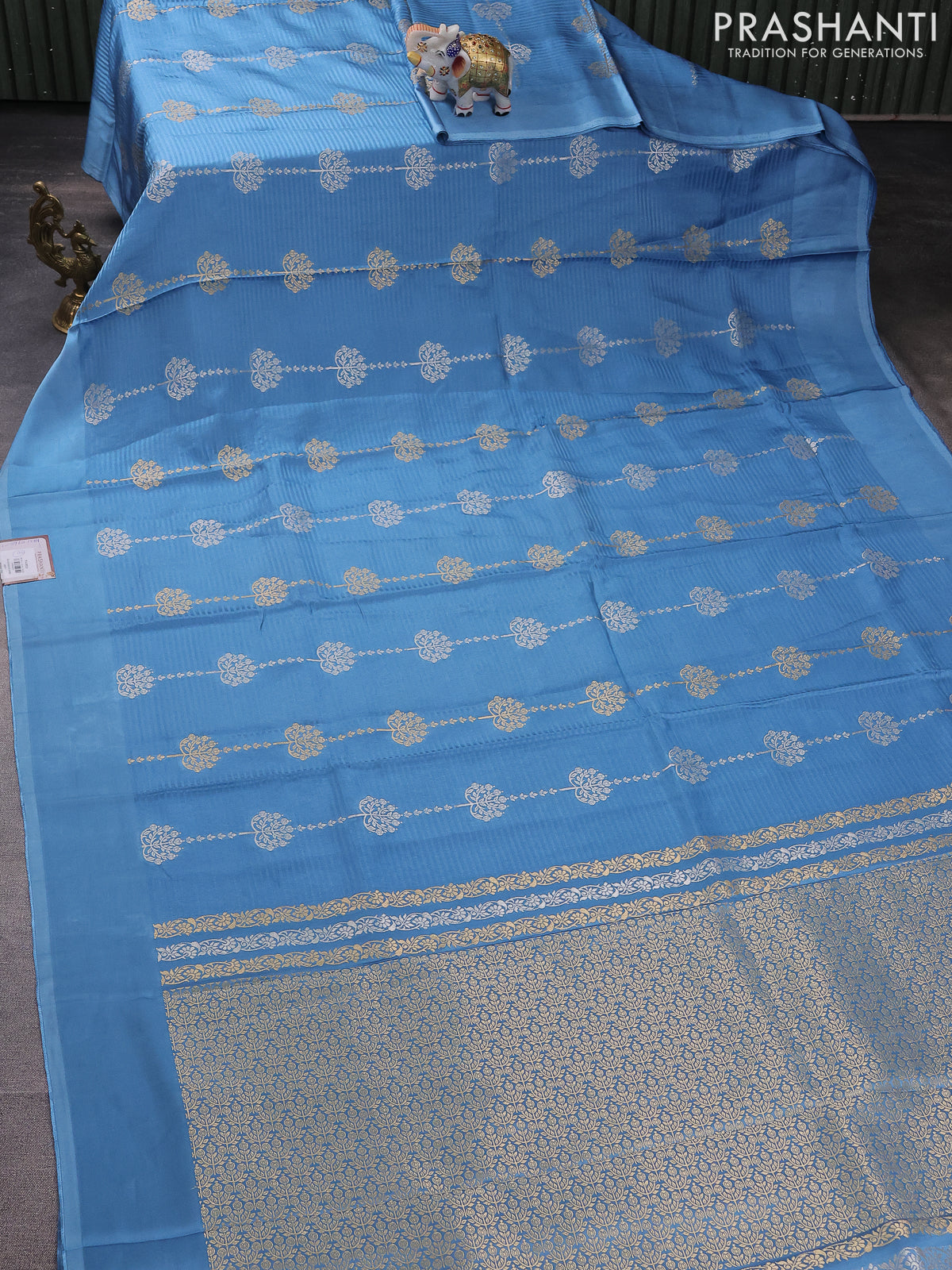Banarasi mushru silk saree light blue with allover stripes pattern & zari buttas and satin border
