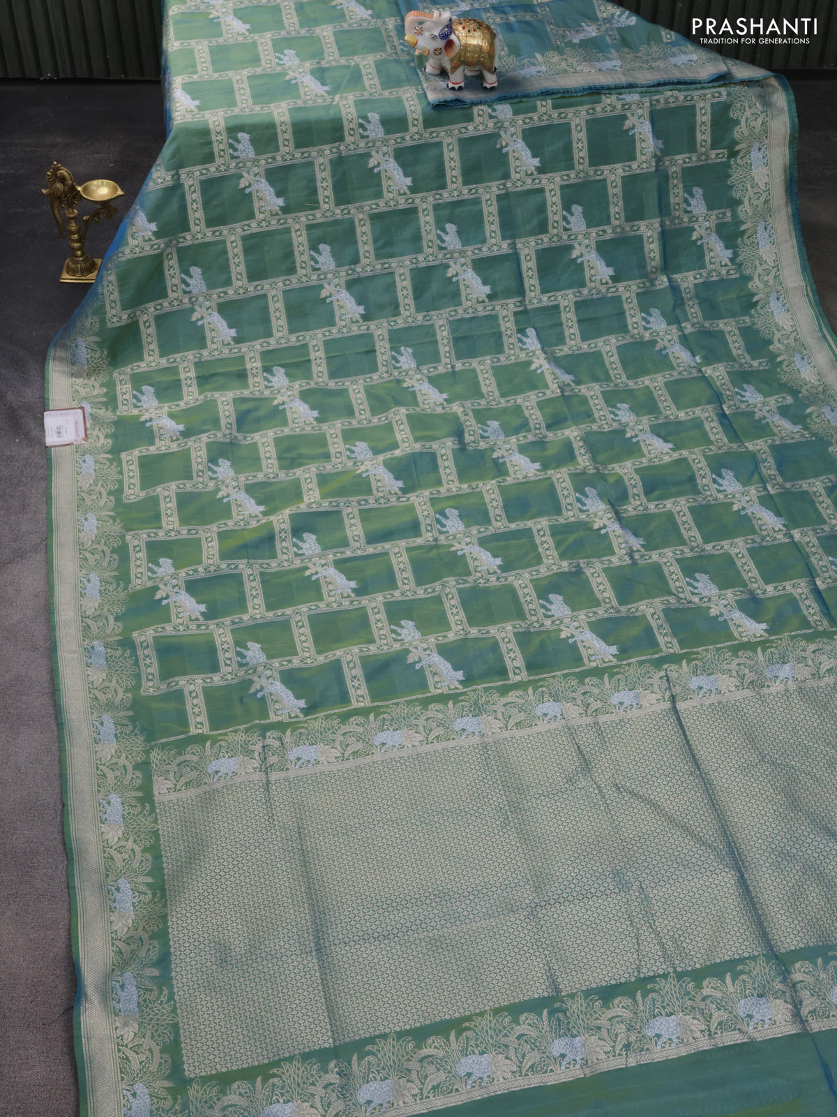 Banarasi semi katan silk saree dual shade of teal bluish green with allover silver & gold zari weaves and zari woven border