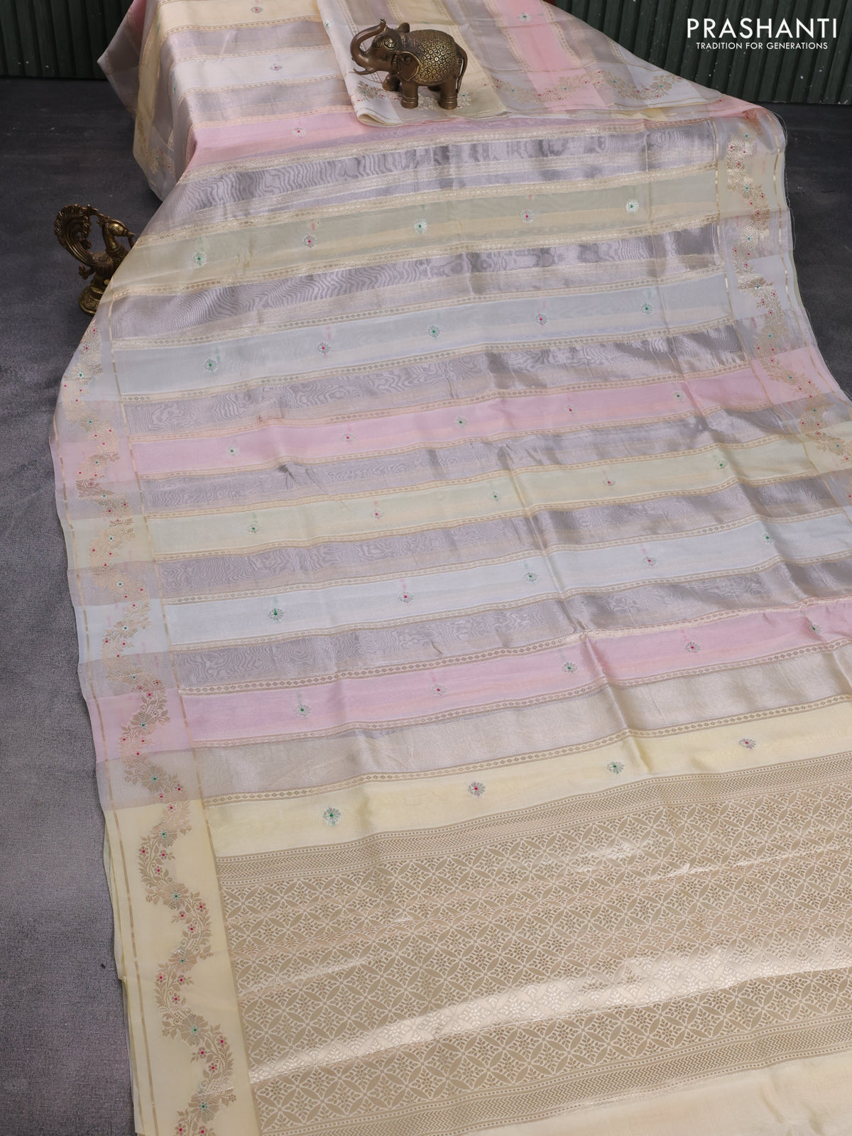 Banarasi tissue semi silk saree mild peach and cream with zari weaves & buttas and zari woven border