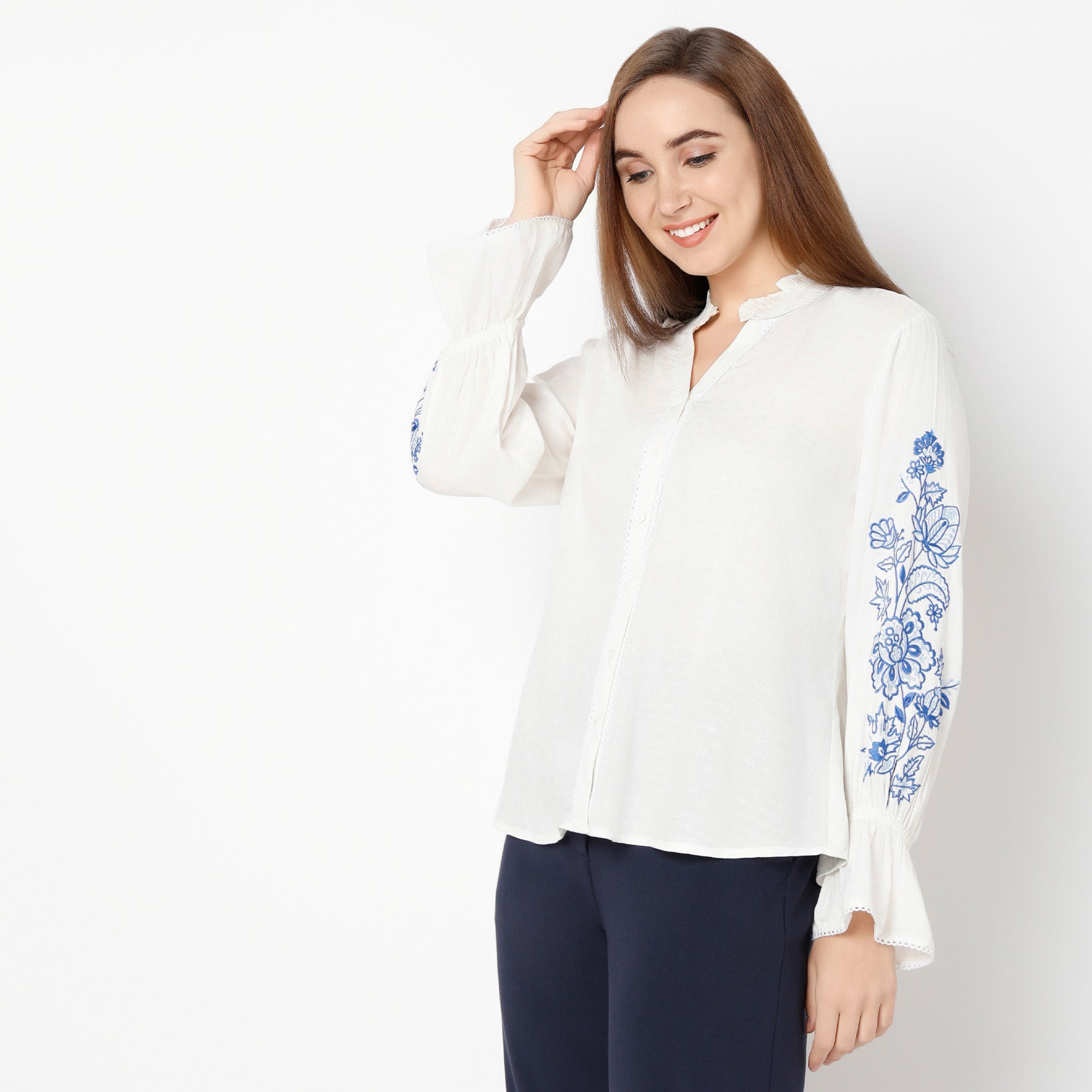 Band Neck Short Length Flared Full Sleeve Relaxed Fit Embroidered Top