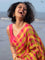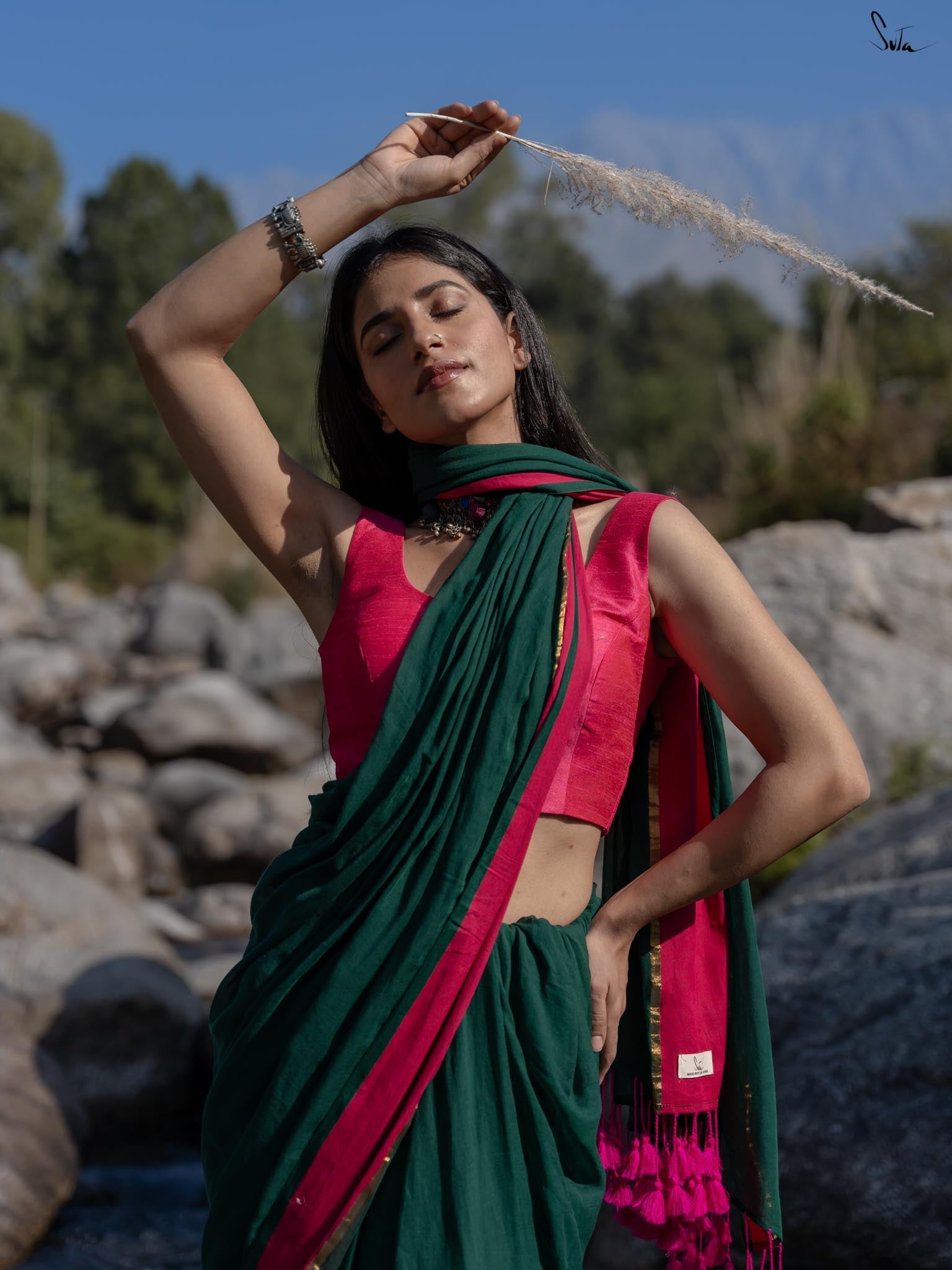 The model is wearing a size M blouse and the saree is Betul