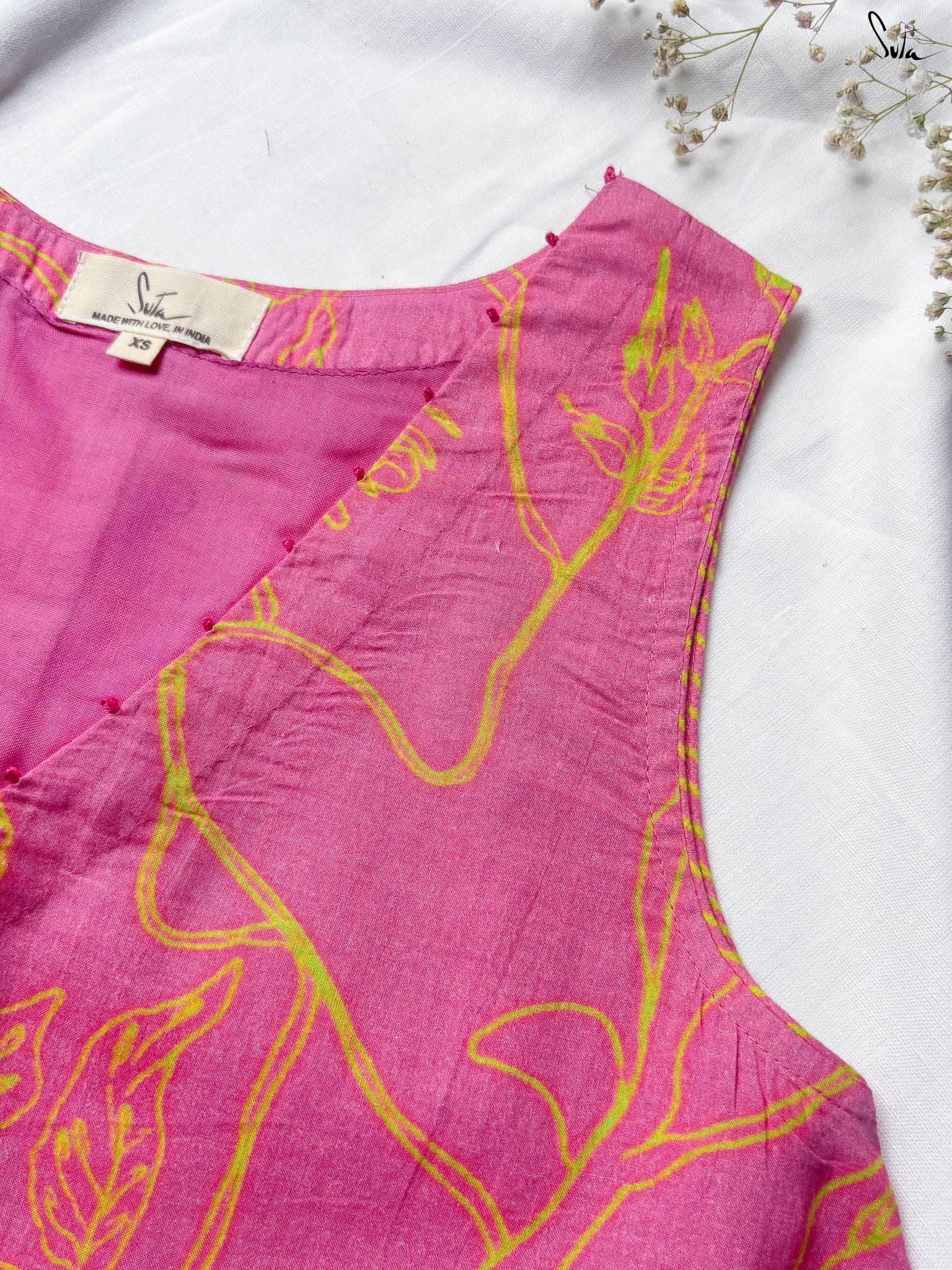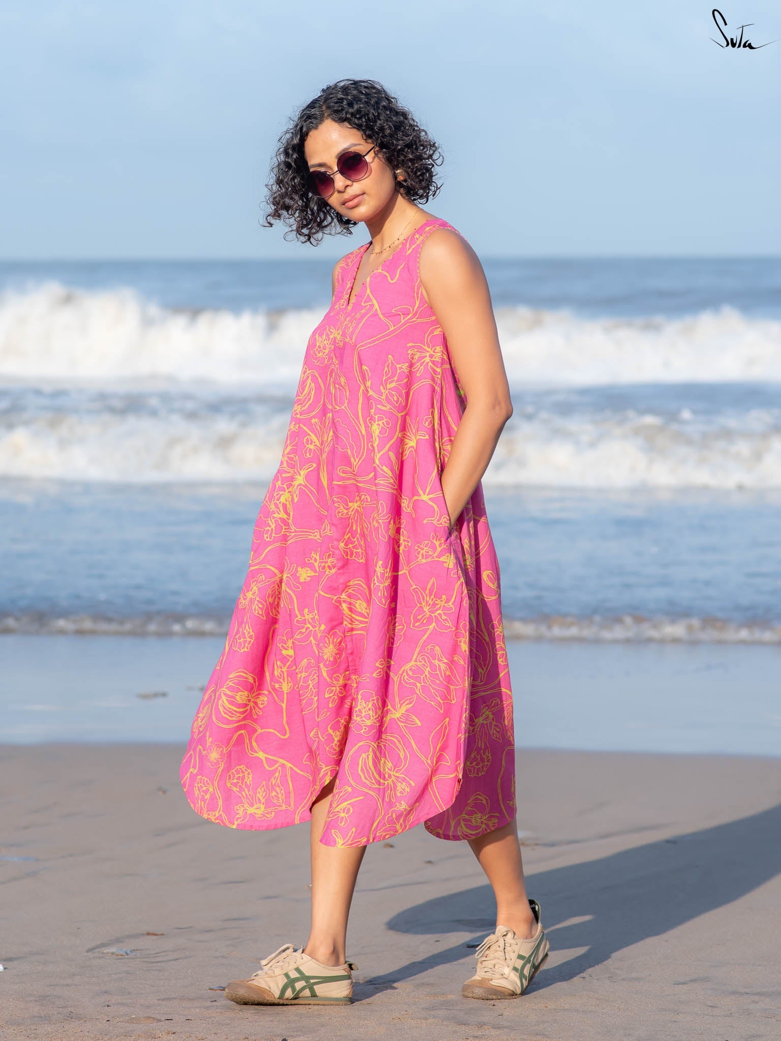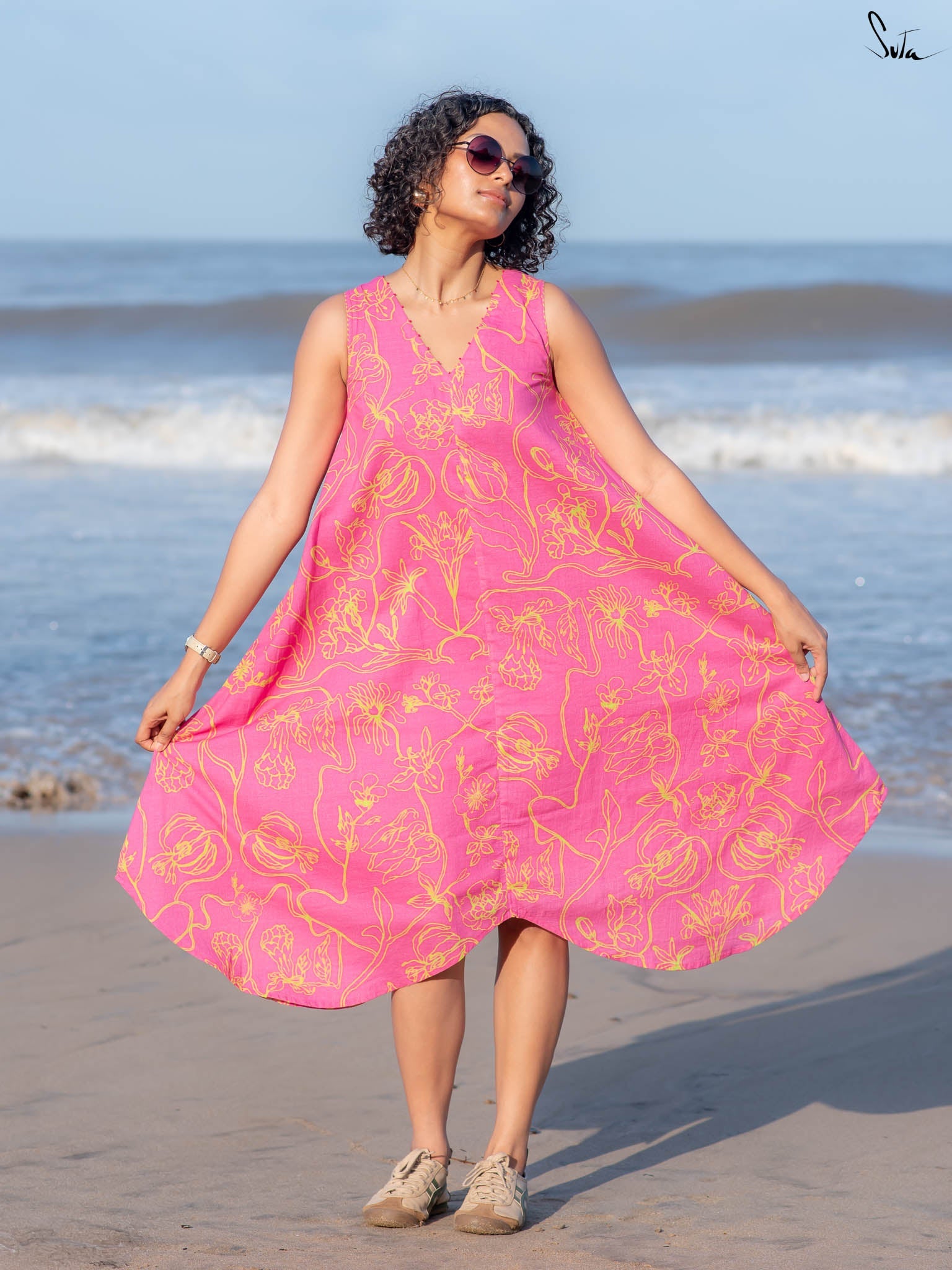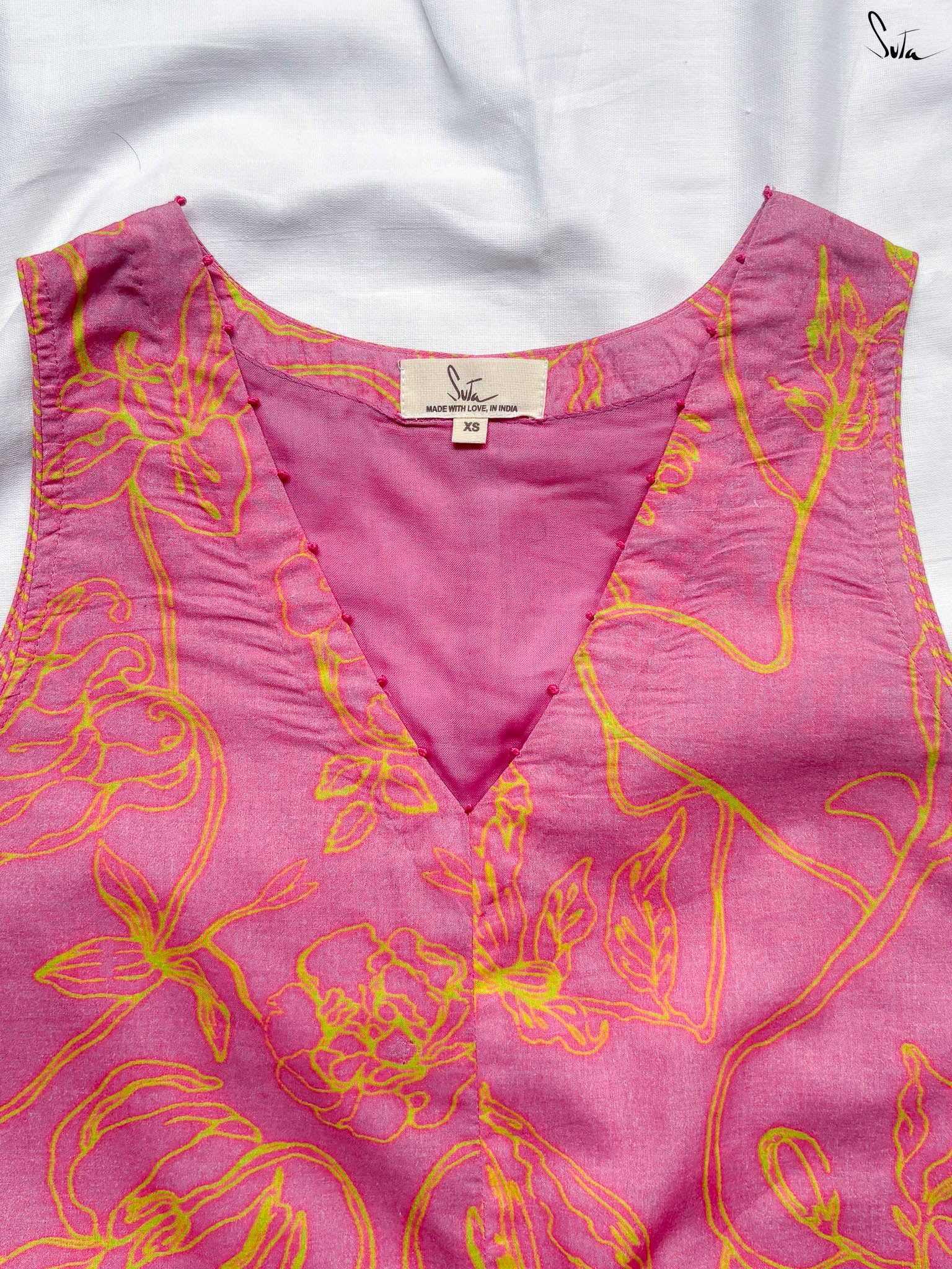 This digitally printed cotton dress is vibrant but wearable, think tropical florals with a sunlit edge. Cut in a sleeveless, V-neck silhouette with French knots stitched along the neckline, it pairs bold prints with subtle detail.