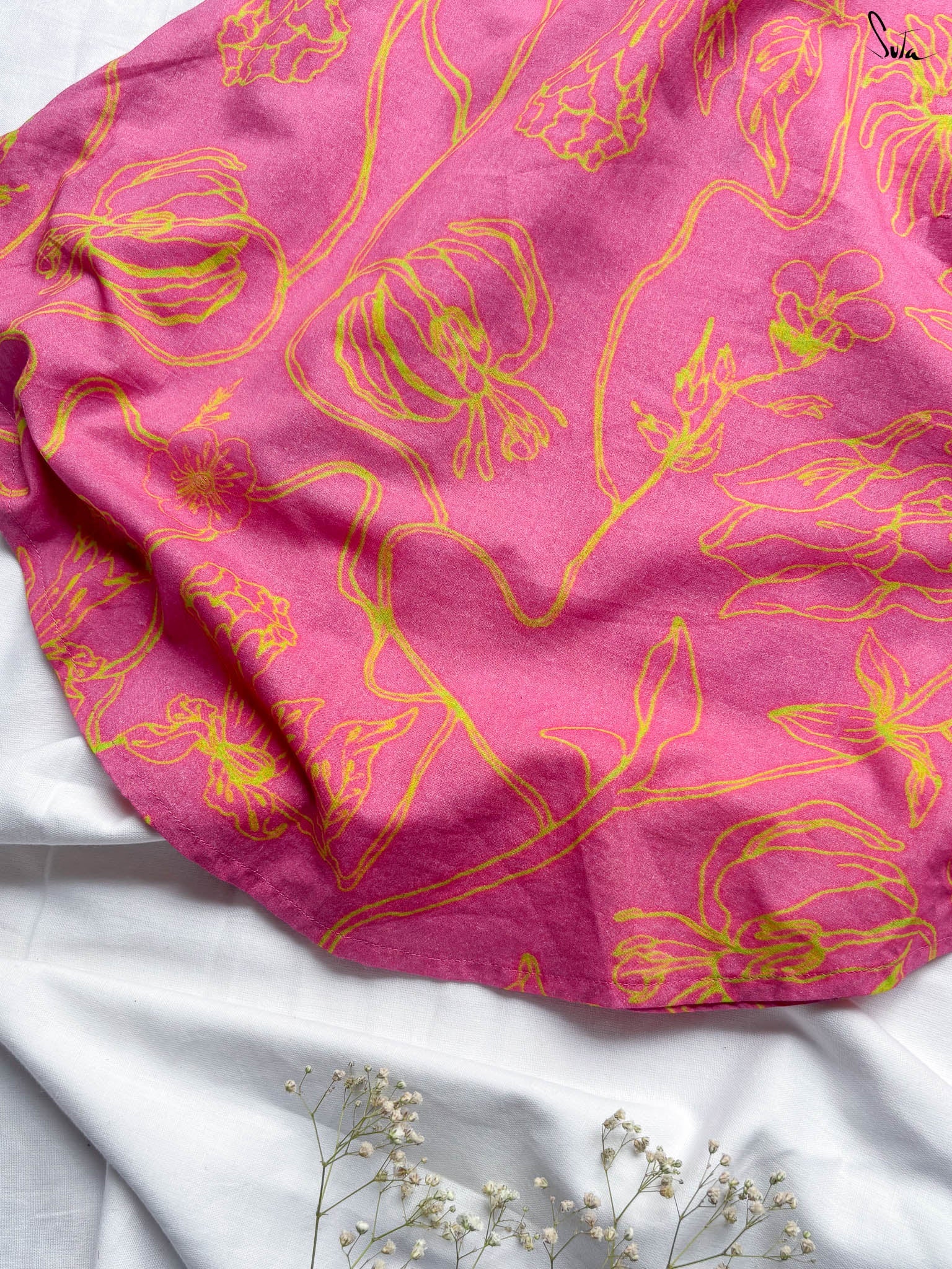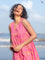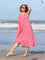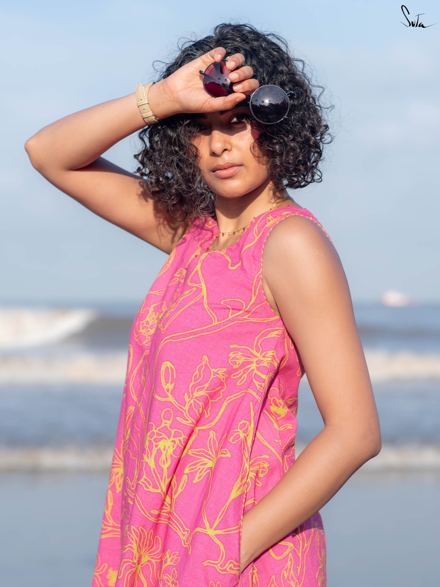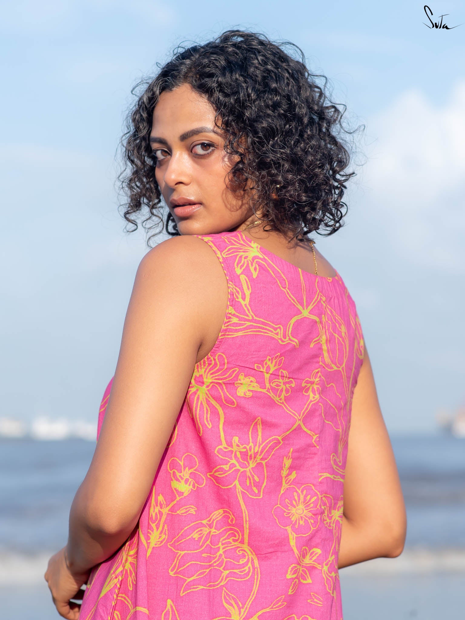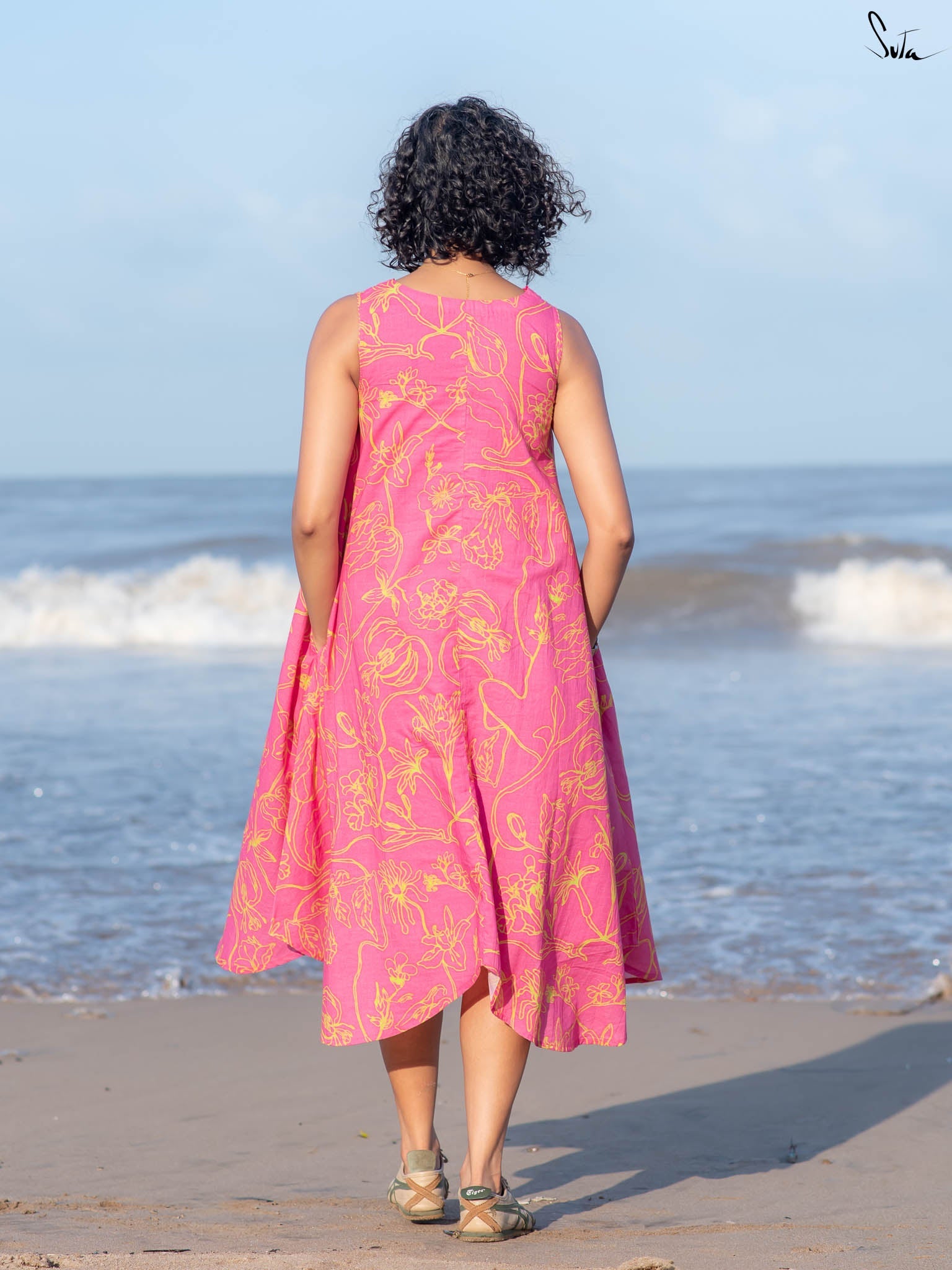 This digitally printed cotton dress is vibrant but wearable, think tropical florals with a sunlit edge. Cut in a sleeveless, V-neck silhouette with French knots stitched along the neckline, it pairs bold prints with subtle detail.