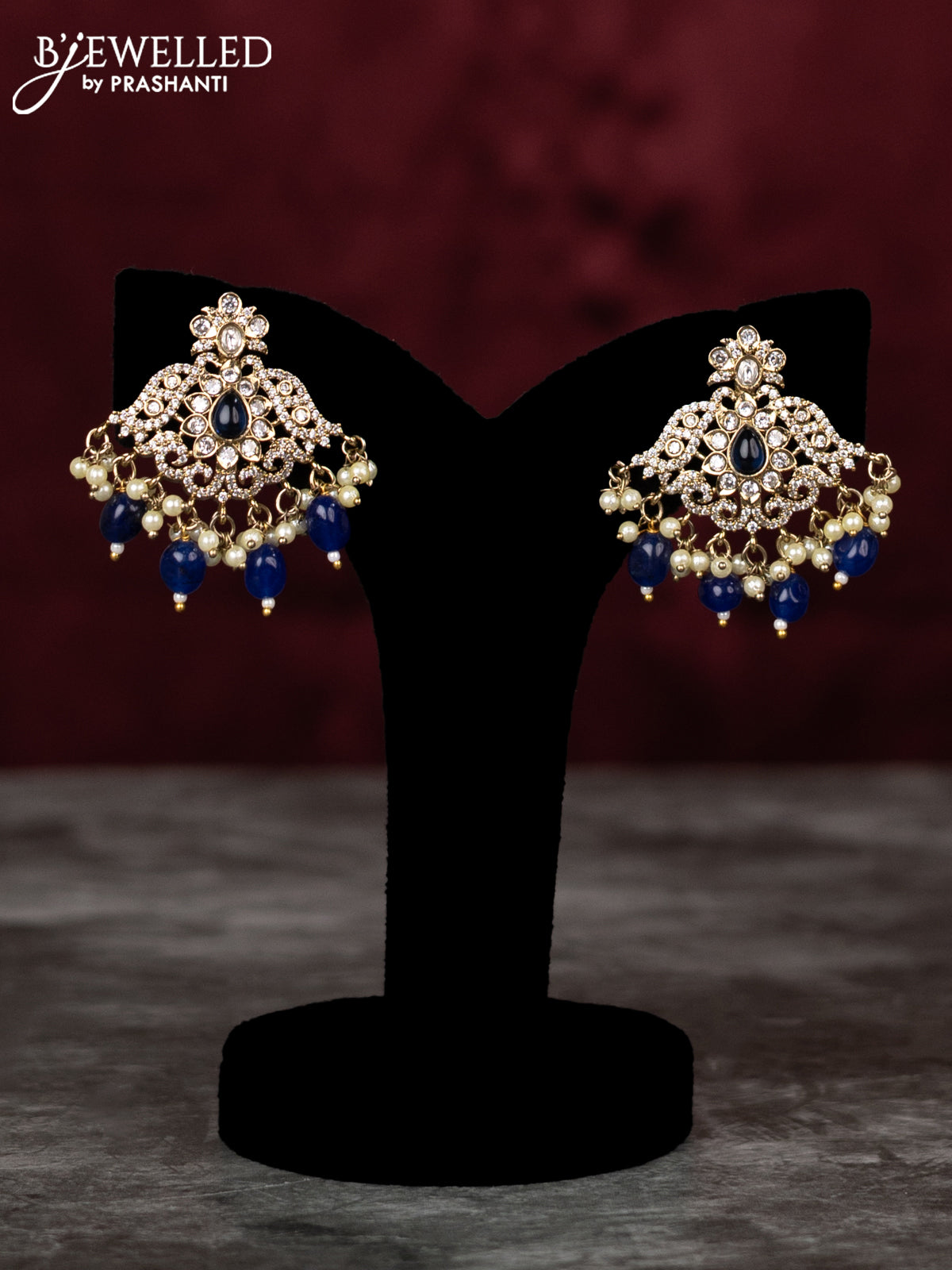 Beaded double layer blue haram with sapphire & kundan cz stones and pearl & beads hangings in victorian finish
