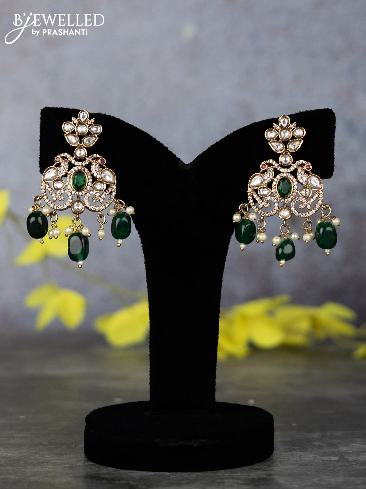 Beaded double layer green haram peacock design with emerald & kundan cz stones and pearl & beads hangings in victorian finish