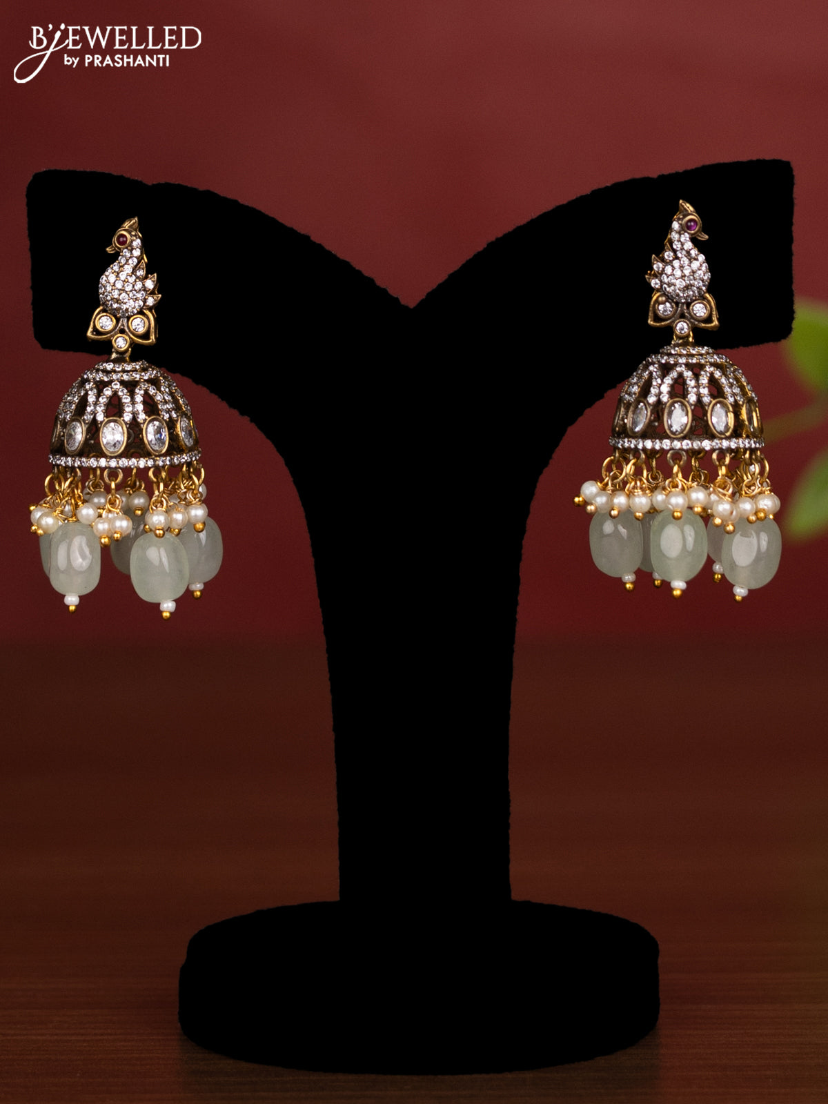 Beaded double layer mint green necklace with cz stones and pearl & beads hanging in victorian finish