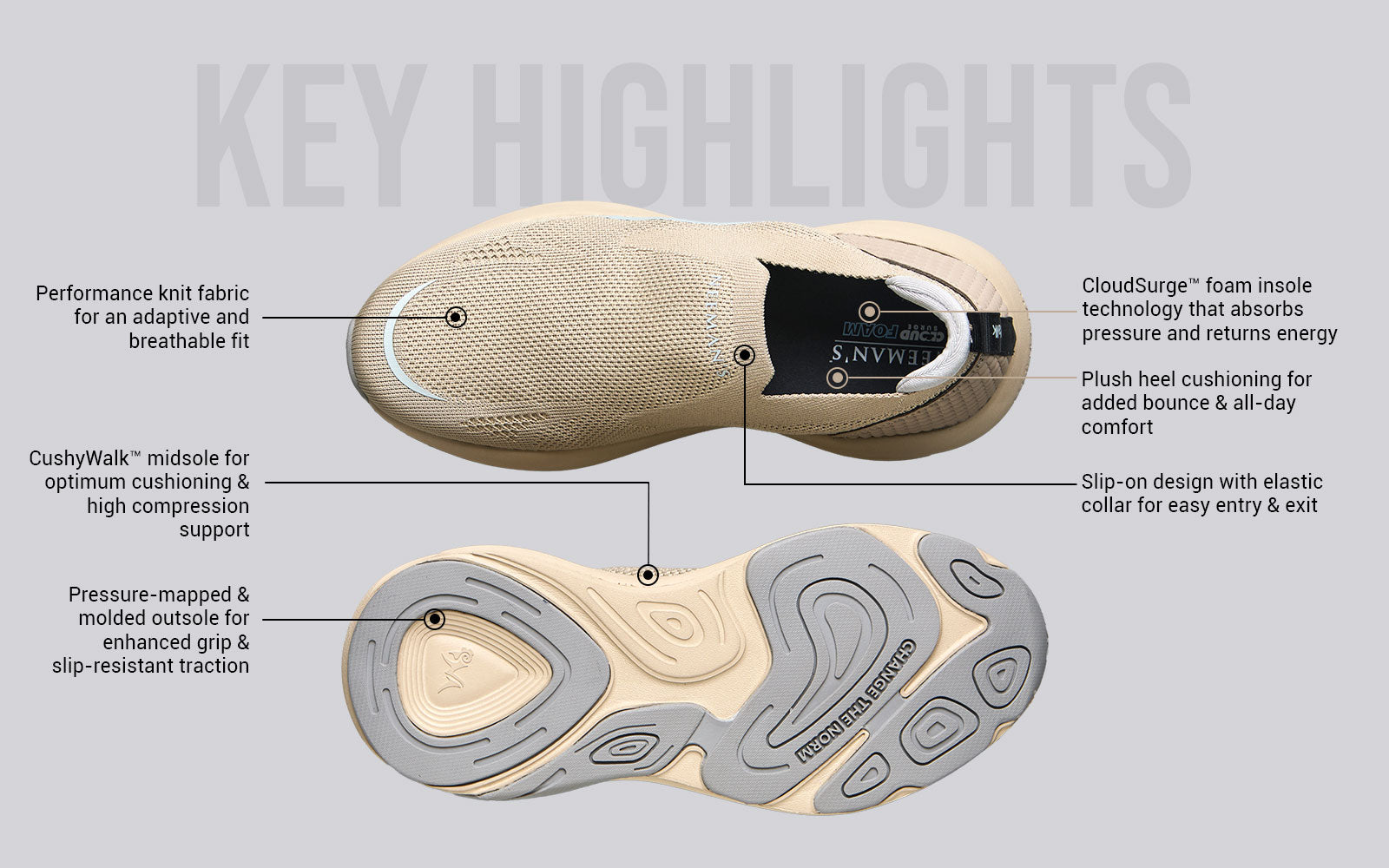 With the dual tech cushioning of our CushyWalk™ midsole and CloudSurge™ foam insole, Begin Walk Ease absorbs pressure and returns energy, adding a bounce to your steps to take on the day’s hustle. Its adaptive performance knit design hugs your feet snugly while keeping them breezy & cool and a pressure-mapped outsole reduces stress on your joints & ankles. This is minimal, with all heart.