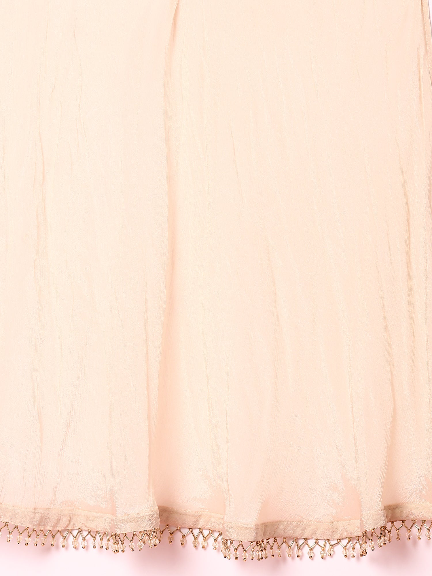 Embrace elegance with this Beige Banaras three-piece set, featuring a short kurta and matching palazzo pants. Crafted with refined Banarasi fabric, it offers a comfortable fit while showcasing intricate traditional patterns. Perfect for festive occasions or casual gatherings, this set blends style and ease, ensuring you feel confident and graceful throughout the day.