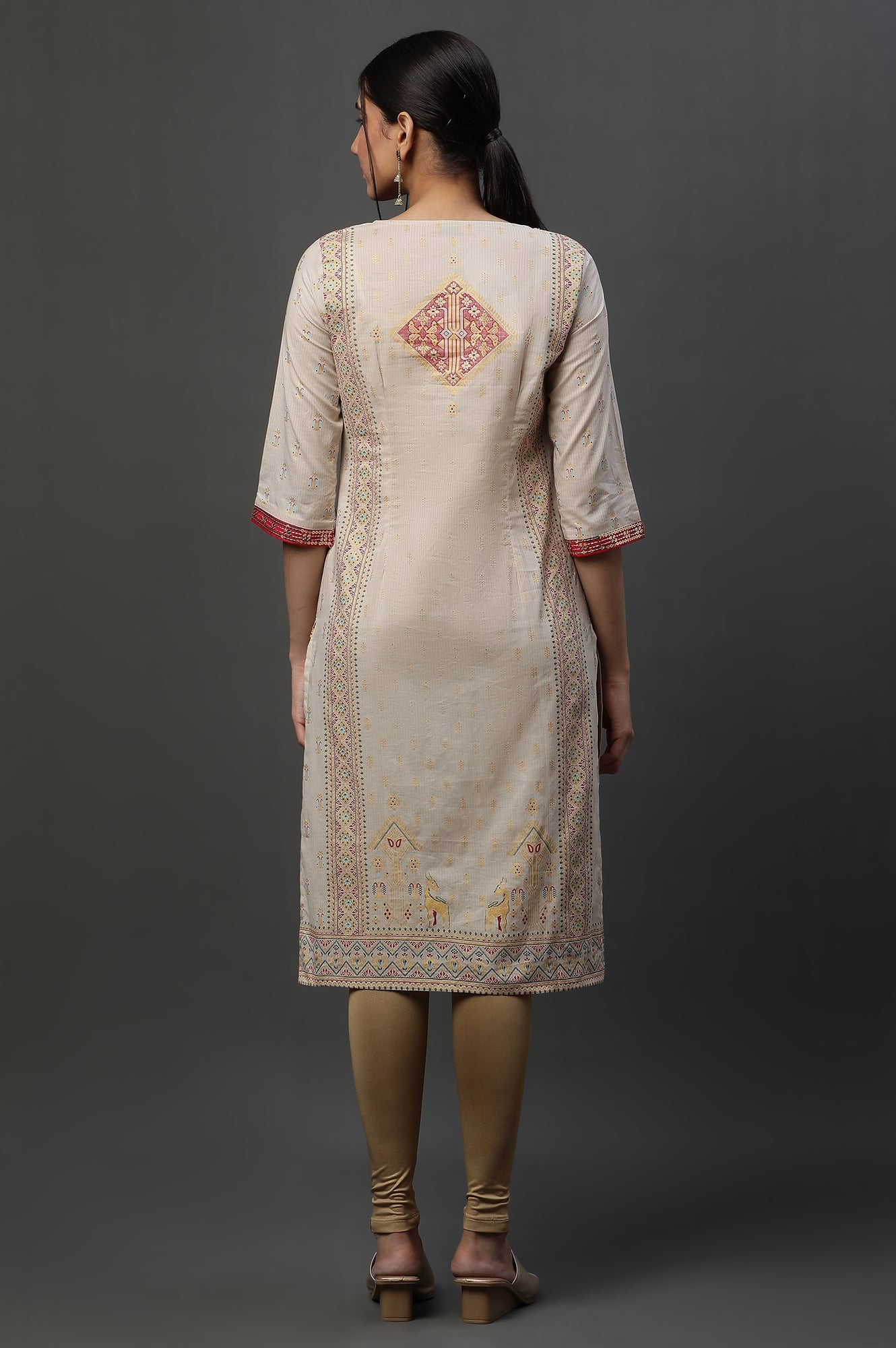 Ivory embellished kurta in stripe printed kurta, with contrast yoke and cuff details.