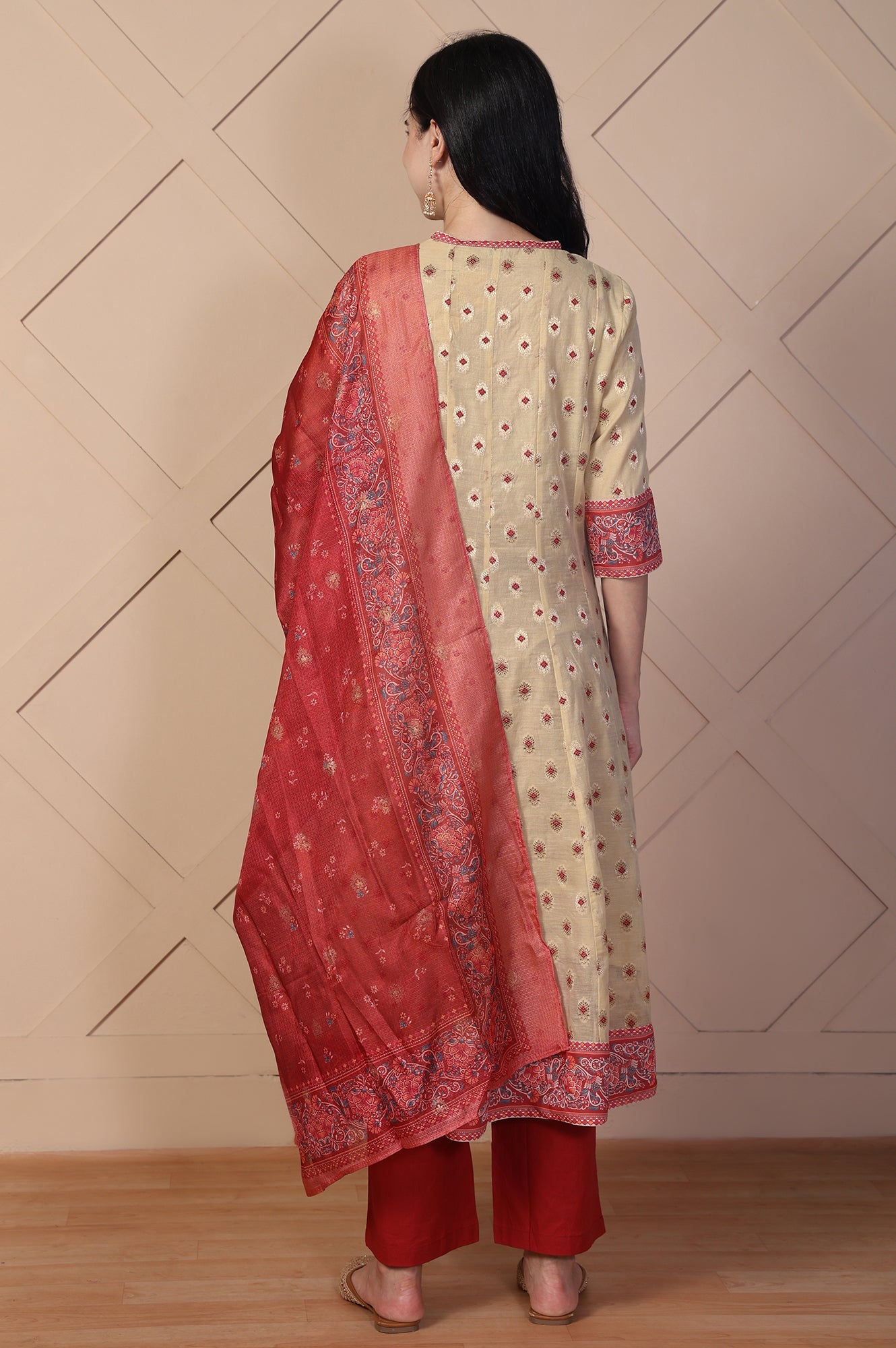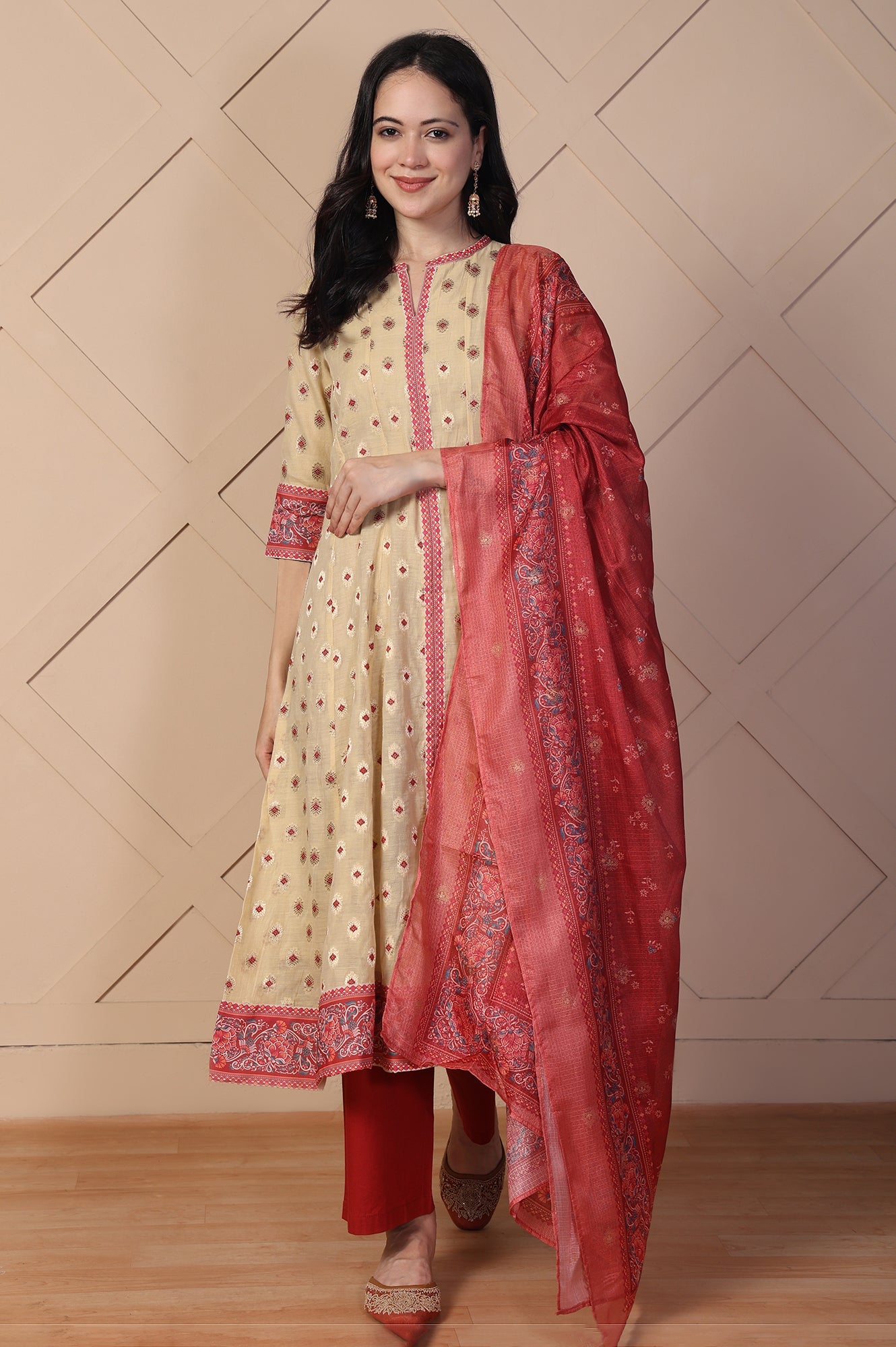 Beige Jacquard A-Line Kurta with Palazzo and Dupatta Set