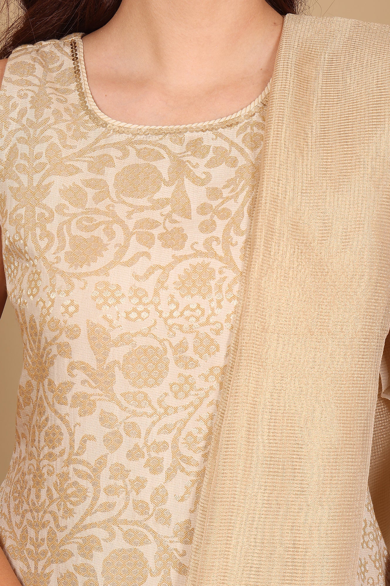 Beige Jacquard Sleeveless Embellished Kurta, Pants And Dupatta Set