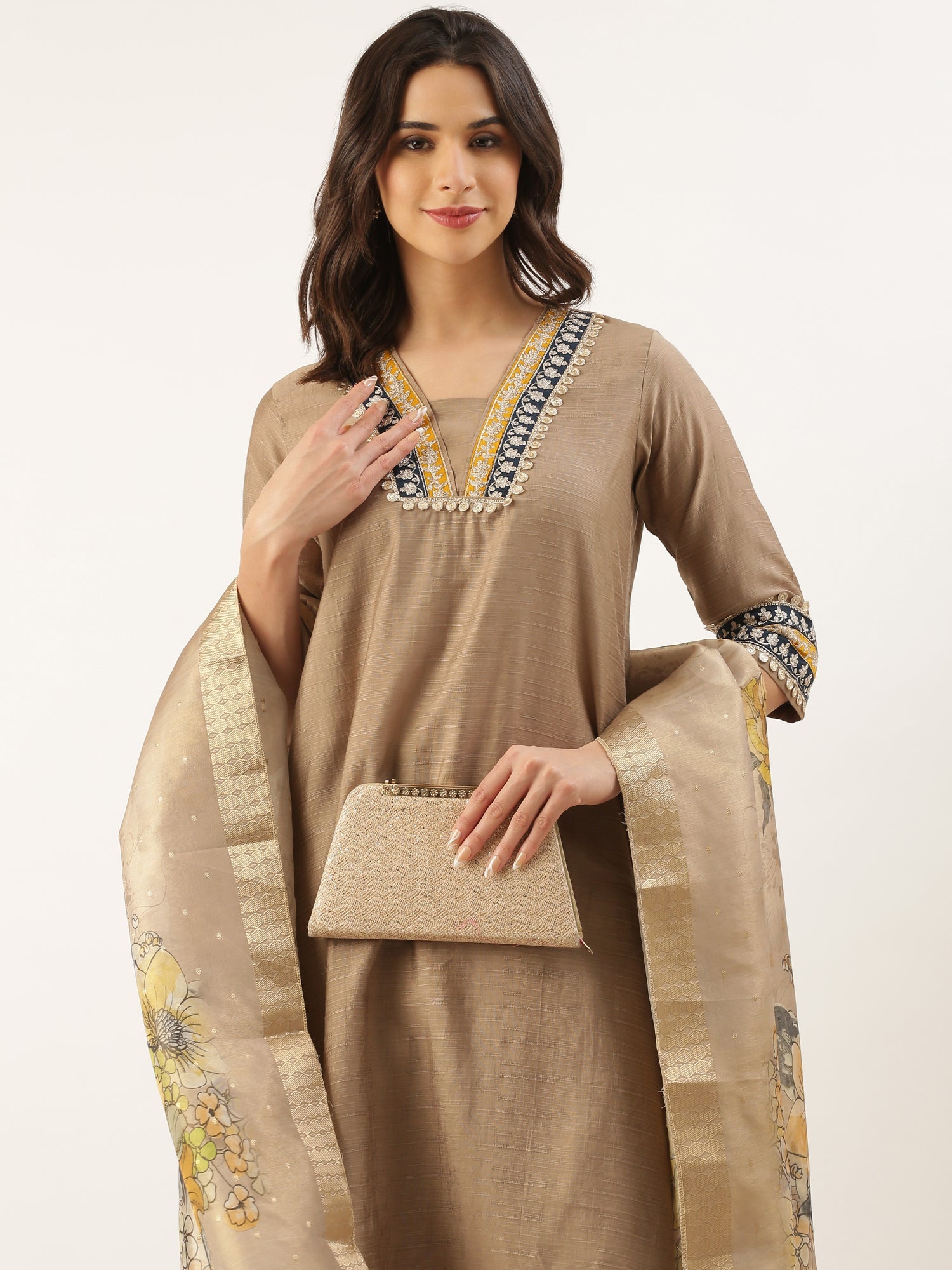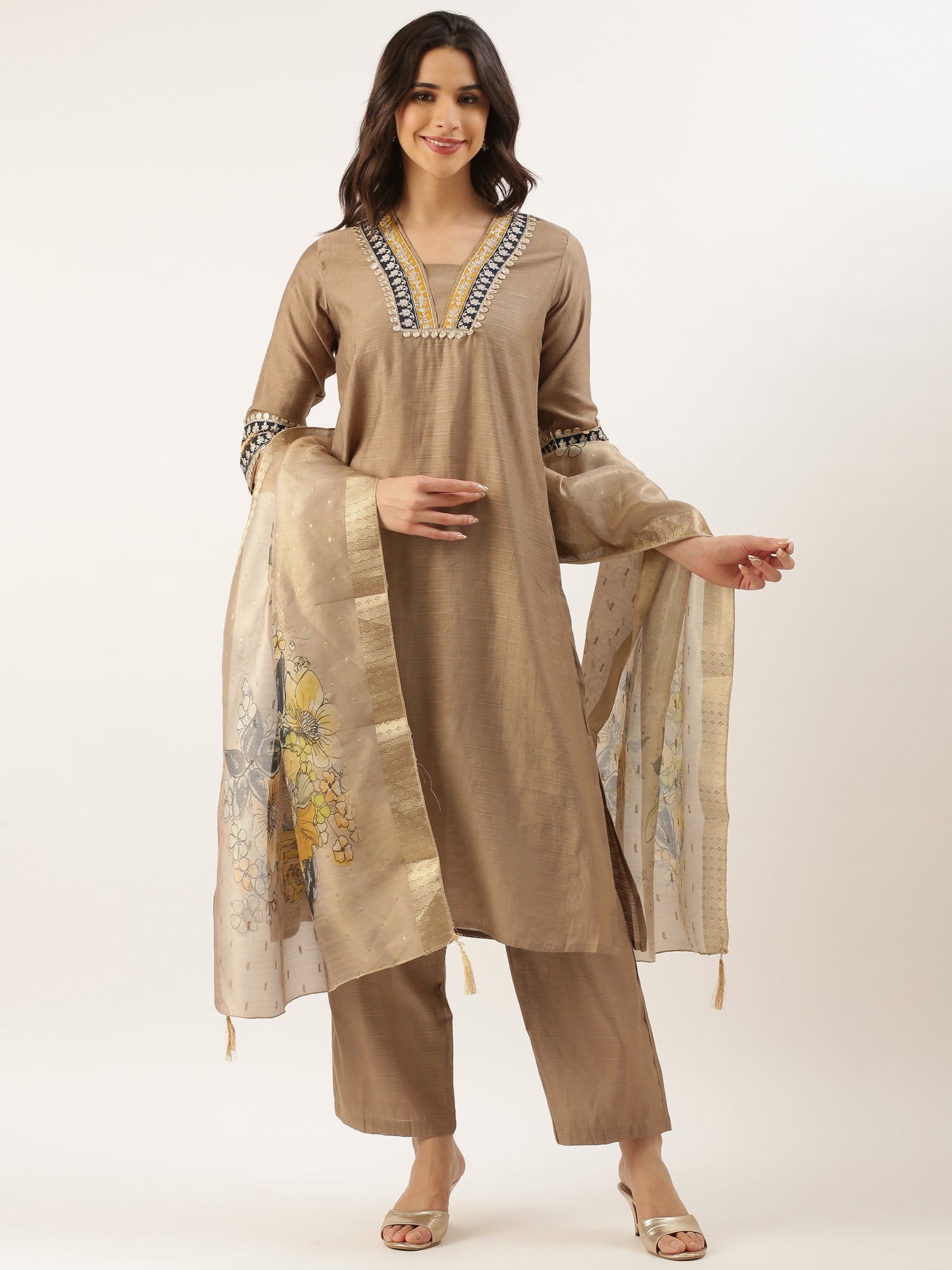 Experience refined elegance with this Beige Modal Silk Three Piece Suit Set. Crafted from soft modal silk, this set offers exceptional comfort and a sophisticated sheen. Its versatile beige tone complements various occasions, making it an ideal choice for formal and semi-formal events. The three-piece design ensures a polished look, combining style with ease of wear. Perfect for those seeking a blend of luxury fabric and timeless tailoring.
