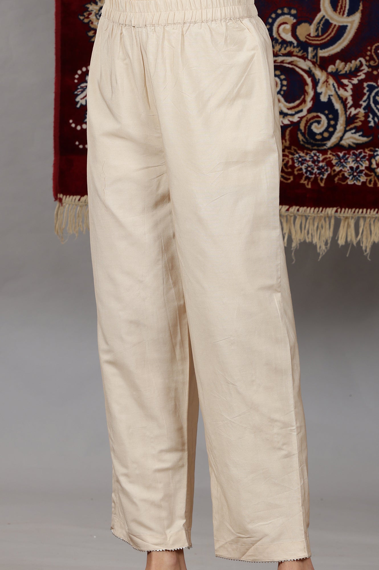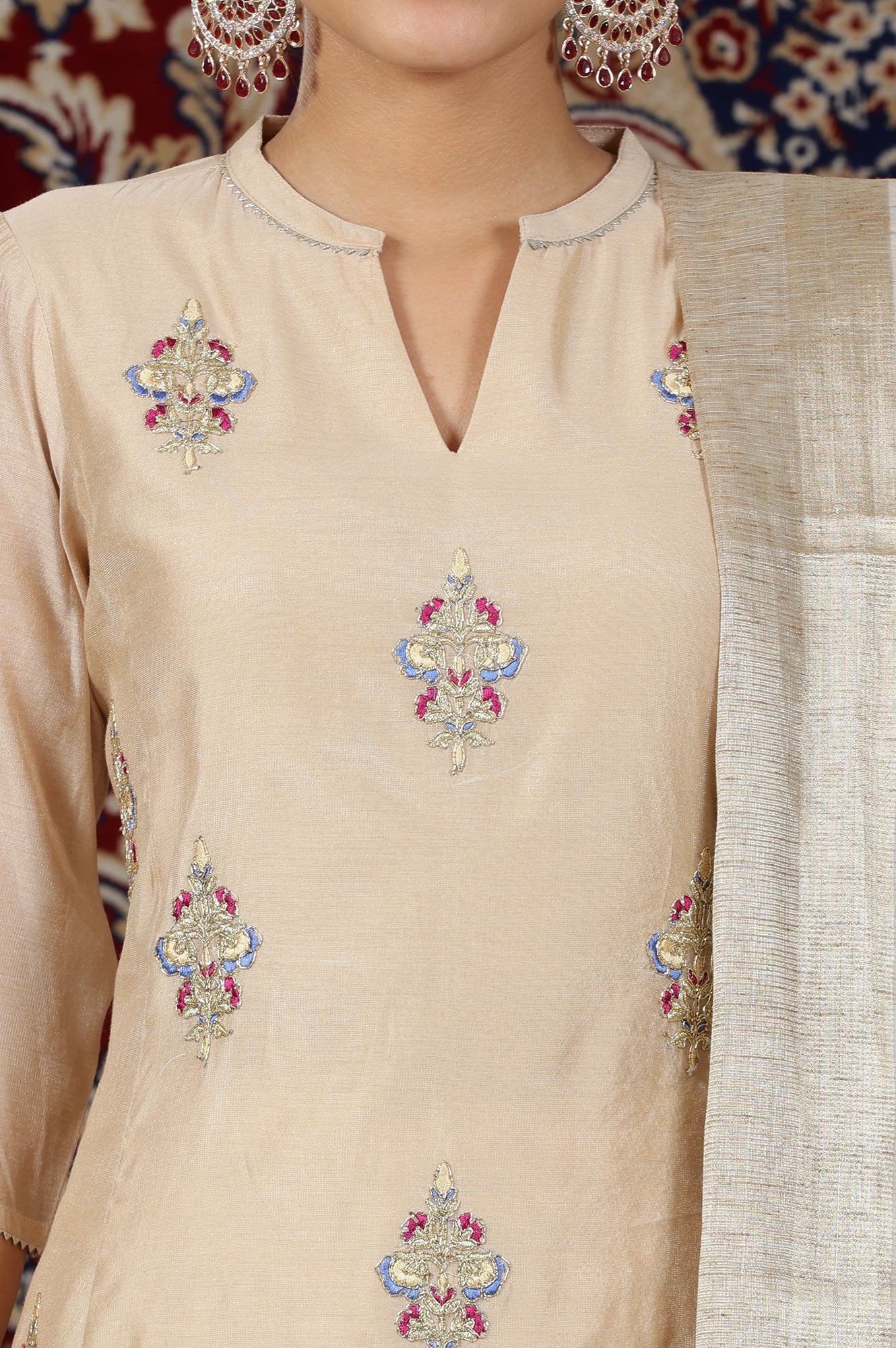 Crafted in a rich beige hue in rich chanderi fabric, this kurta set offers unrivalled comfort and Sophistication. The 3d all over buta embroidery looks very unique and combining with the drape, enriches the look of the set.
