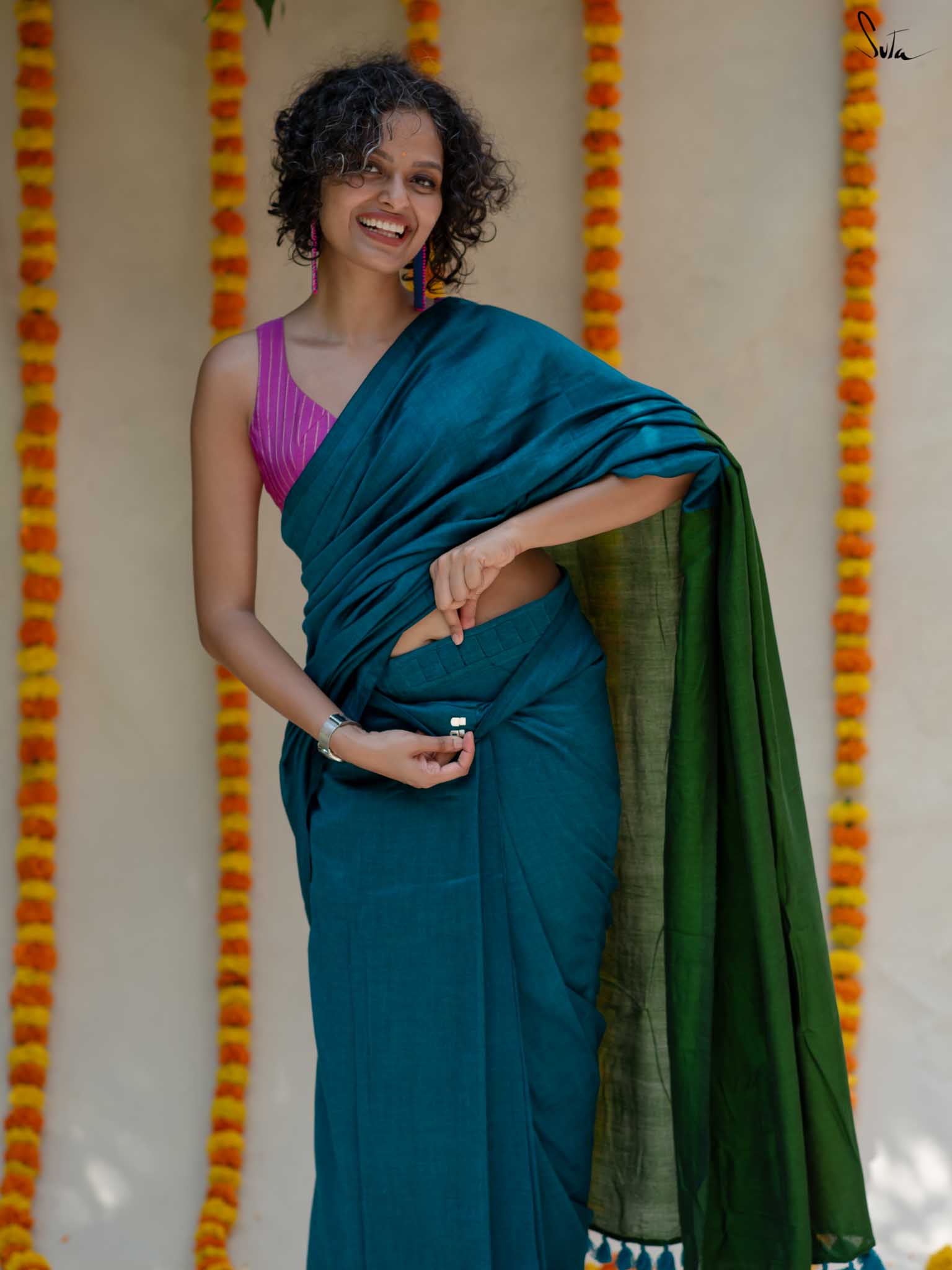 Cotton fabric dates back to some of the most ancient civilisations and it has a strong presence in the modern wardrobe as well. The softness and lightness of cotton combined with its strength and versatility makes it one of the most popular choices, especially for the Indian climate. We took this simple, elegant fabric and combined it with acrylic for that added sheen and voila! We love what we see and the saree falls so beautifully that it feels like second-skin!