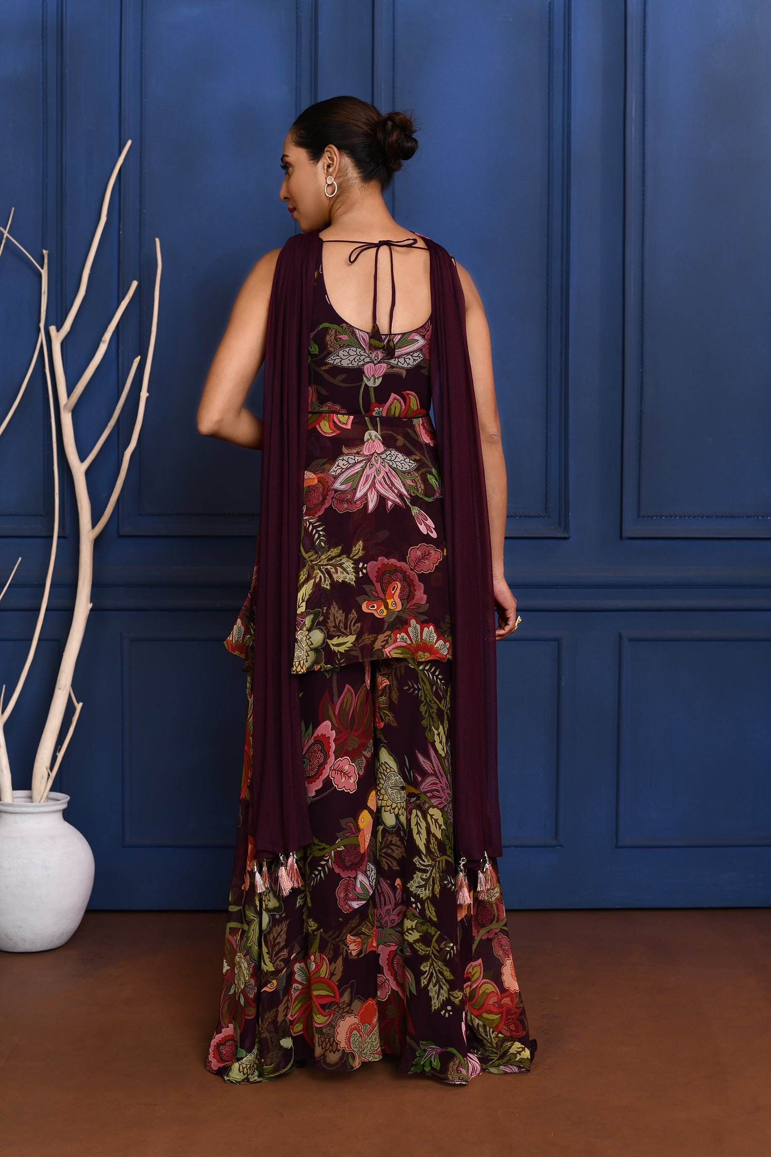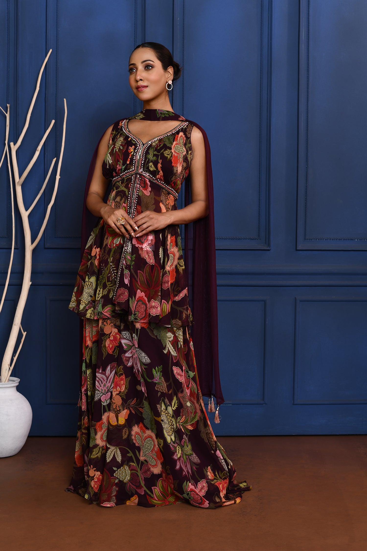 The berry purple floral georgette peplum set with matching sharara and dupatta for a stylish ethnic look with subtle elegance.
