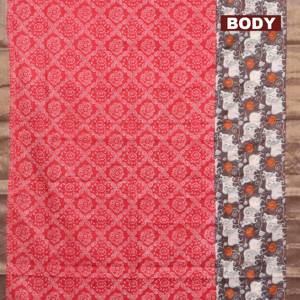 Bhagalpuri saree red and brown with allover bandhani prints and long pichwai printed zari woven border