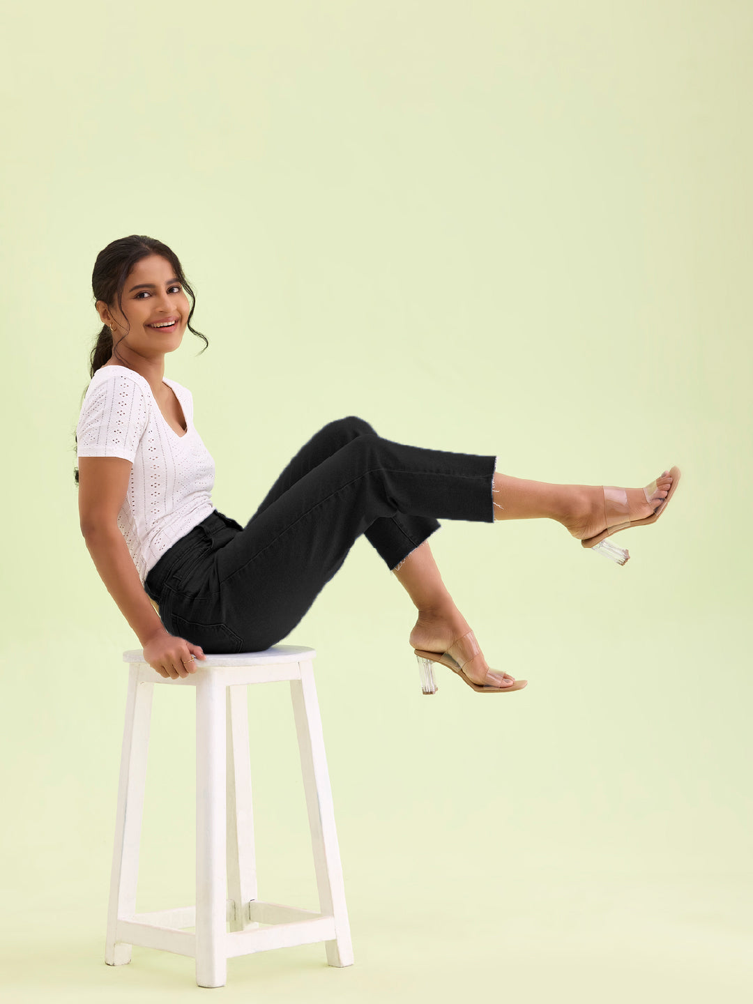 Look stylish in this pair of Black cropped jeans. The pair features a mid rise with zipper fly with button closure with 5 pockets i.e. 2 front jean pocket, 2 back patch pocket & one coin pocket. These denim are made of cotton, polyester, viscose & spandex fabric with a solid finish & a non stretchable waist band.