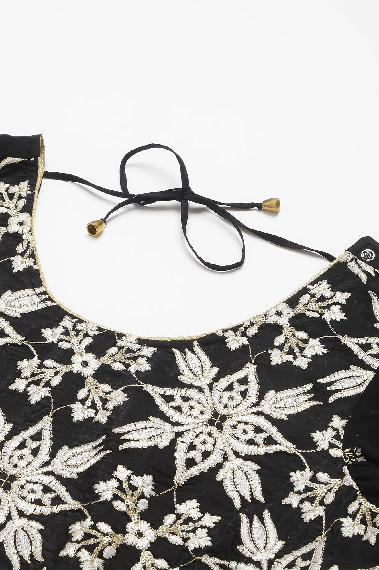 Make Heads Turn At Any Occasion In This Fashionable Black 3D Embroidered Crop Top And Semi Flare Palazzos. It Has A Pre Stitched Saree Drape Which Looks Very Gorgeous When Worn And Is Super Comfortable To Wear. It Is A Must Have This Season And Is Sure To Earn You Compliments.