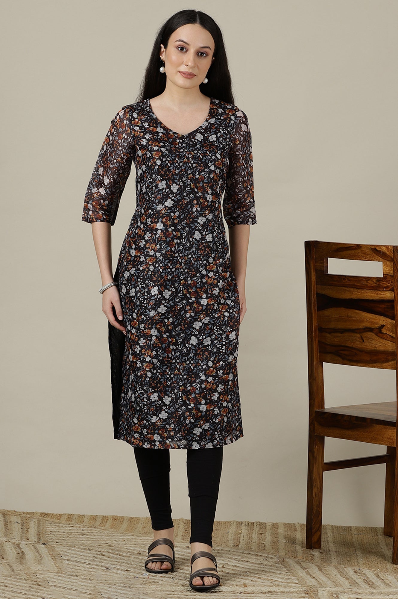 Refine your everyday ethnic style with this black floral printed V-neck straight kota kurta from Aurelia.