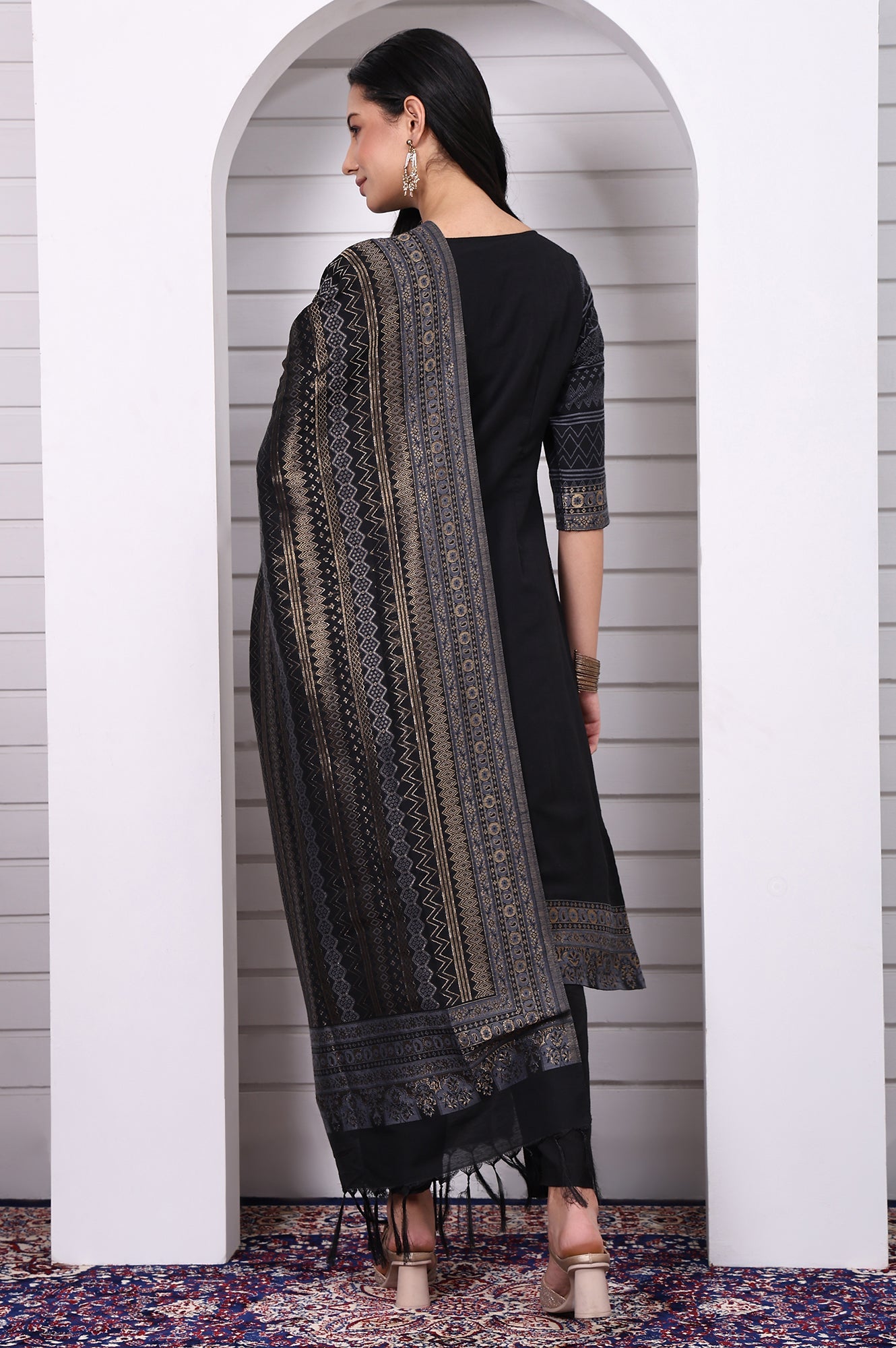 Black Geometric Printed Hand Work Jacquard Straight Kurta, Palazzo and Dupatta Set